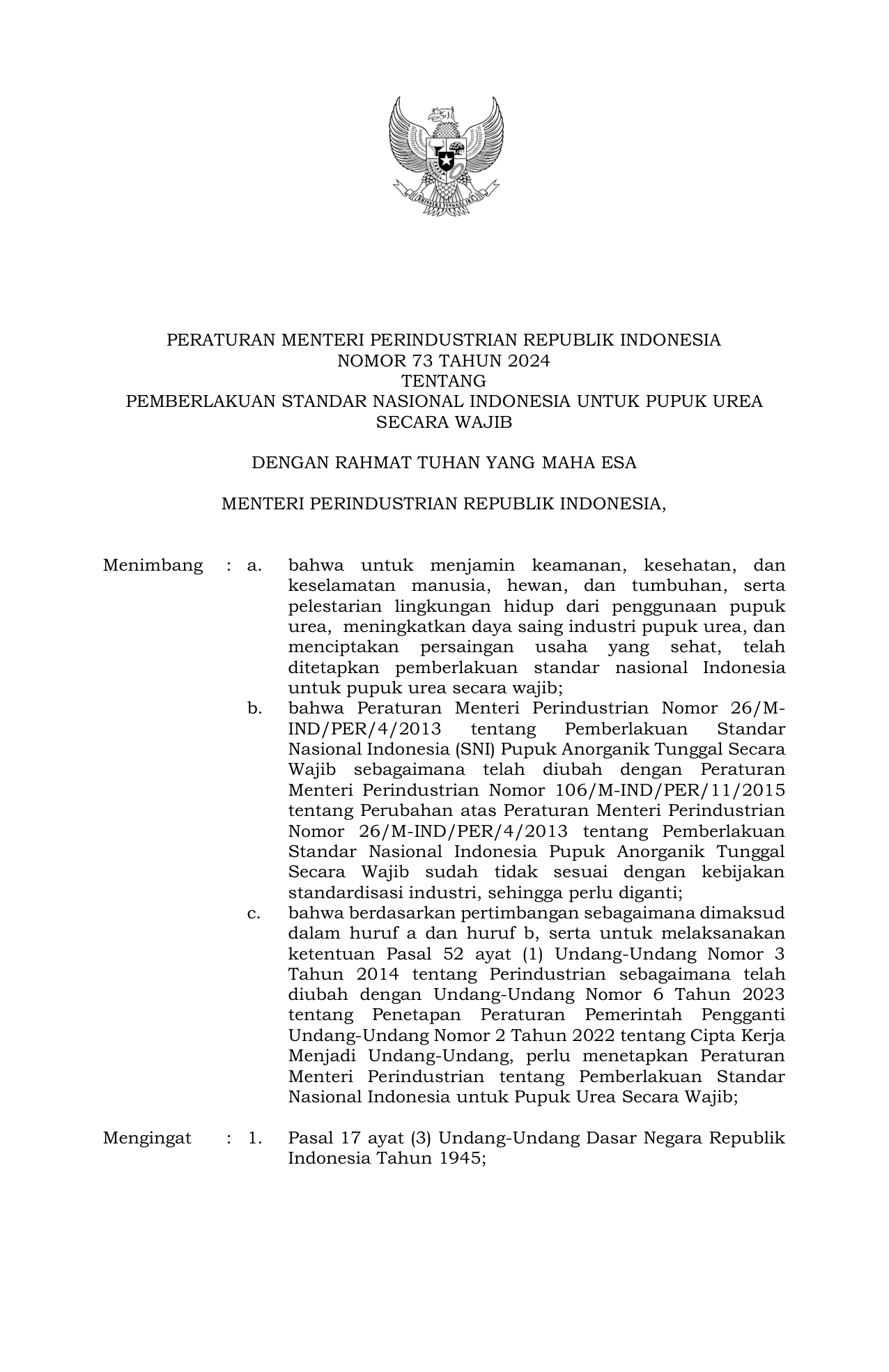 PERMEN Nomor 73 Tahun 2024 | Peraturan Menteri Nomor 73 Tahun 2024 tentang Pemberlakuan Standar Nasional Indonesia Untuk Pupuk Urea Secara Wajib