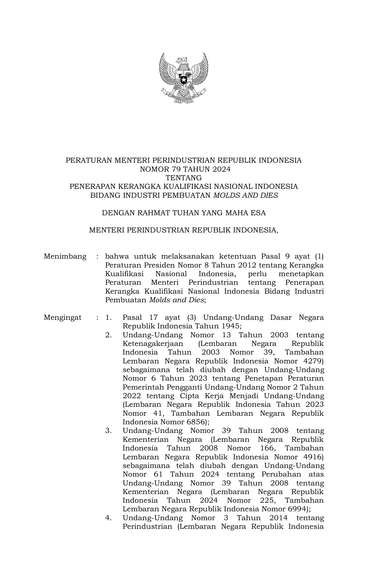 PERMEN Nomor 79 Tahun 2024 | Peraturan Menteri Nomor 79 Tahun 2024 tentang Penerapan Kerangka Kualifikasi Nasional Indonesia Bidang Industri Pembuatan Molds And Dies