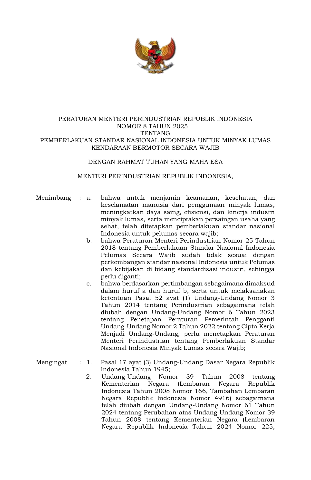 PERMEN Nomor 8 Tahun 2025 | Peraturan Menteri Nomor 8 Tahun 2025 tentang Pemberlakuan Standar Nasional Indonesia Untuk Minyak Lumas Kendaraan Bermotor Secara Wajib