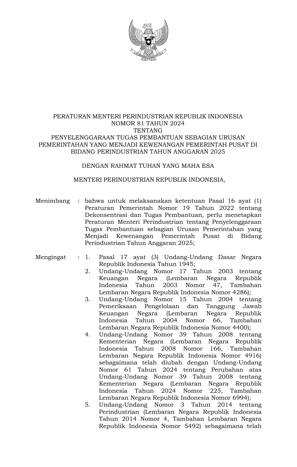 PERMEN Nomor 81 Tahun 2024 | Peraturan Menteri Nomor 81 Tahun 2024 tentang Penyelenggaraan Tugas Pembantuan Sebagian Urusan Pemerintahan Yang Menjadi Kewenangan Pemerintah Pusat Di Bidang Perindustrian Tahun Anggaran 2025