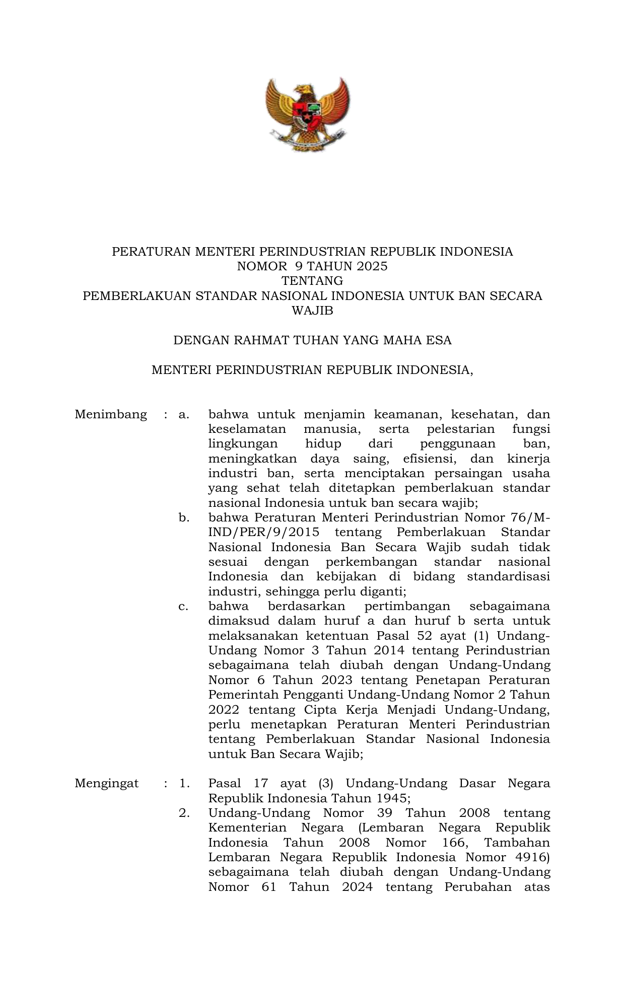 PERMEN Nomor 9 Tahun 2025 | Peraturan Menteri Nomor 9 Tahun 2025 tentang Pemberlakuan Standar Nasional Indonesia Untuk Ban Secara Wajib