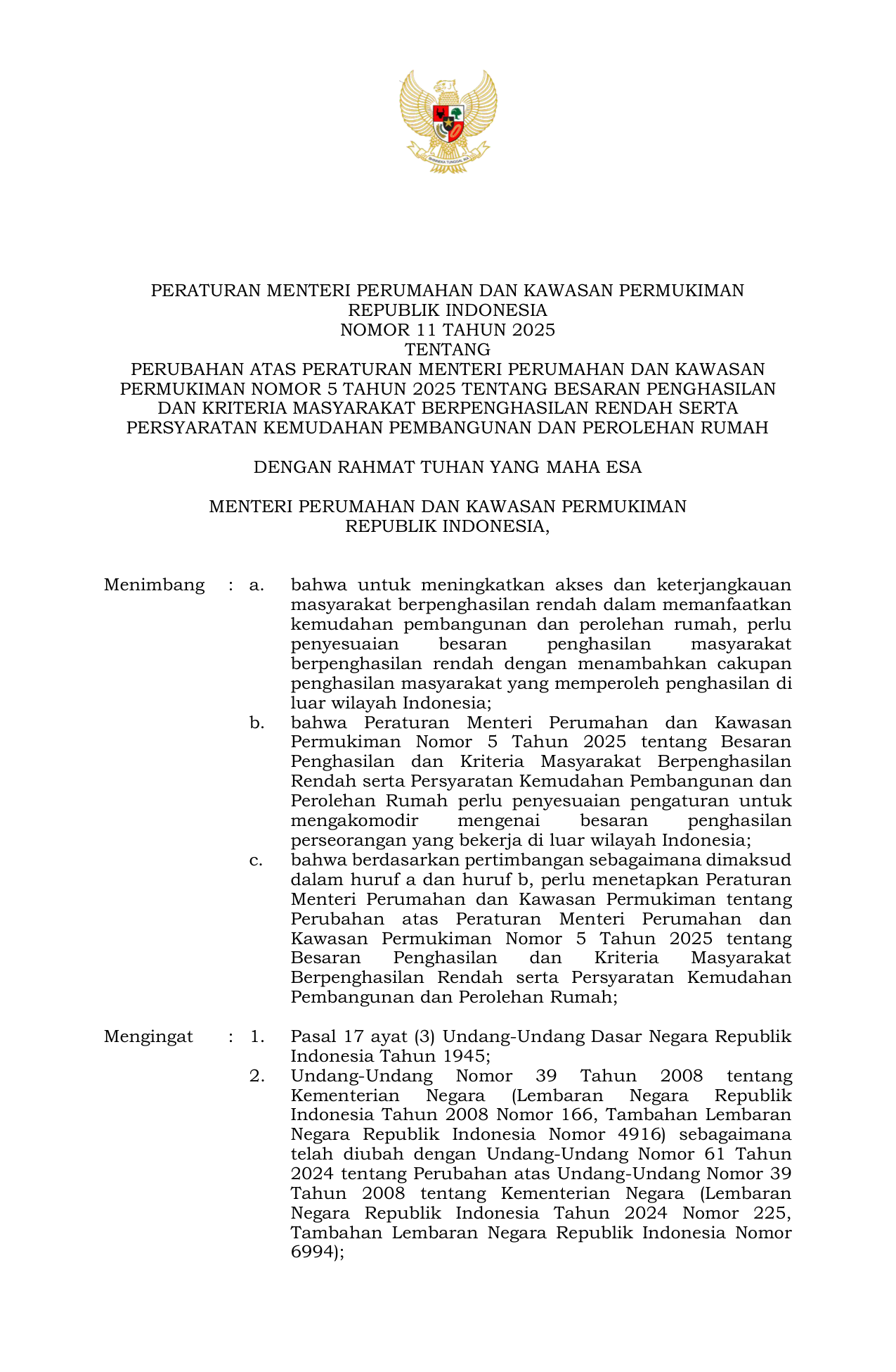PERMEN Nomor 11 Tahun 2025 | Peraturan Menteri Nomor 11 Tahun 2025 tentang PERUBAHAN ATAS PERATURAN MENTERI PERUMAHAN DAN KAWASAN PERMUKIMAN NOMOR 5 TAHUN 2025 TENTANG BESARAN PENGHASILAN DAN KRITERIA MASYARAKAT BERPENGHASILAN RENDAH SERTA PERSYARATAN KEMUDAHAN PEMBANGUNAN DAN PEROLEHAN RUMAH