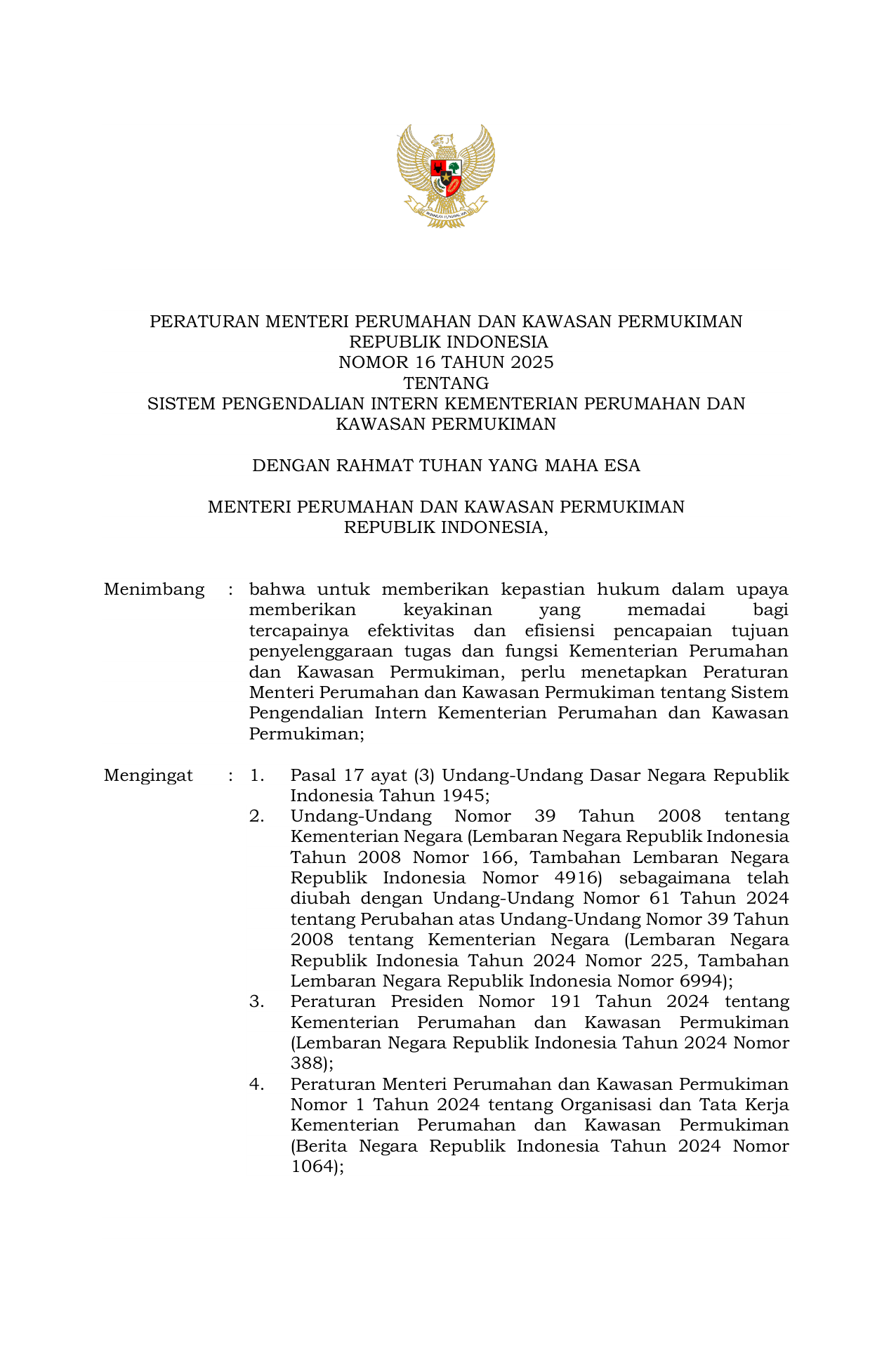 PERMEN Nomor 16 Tahun 2025 | Peraturan Menteri Nomor 16 Tahun 2025 tentang SISTEM PENGENDALIAN INTERN KEMENTERIAN PERUMAHAN DAN KAWASAN PERMUKIMAN