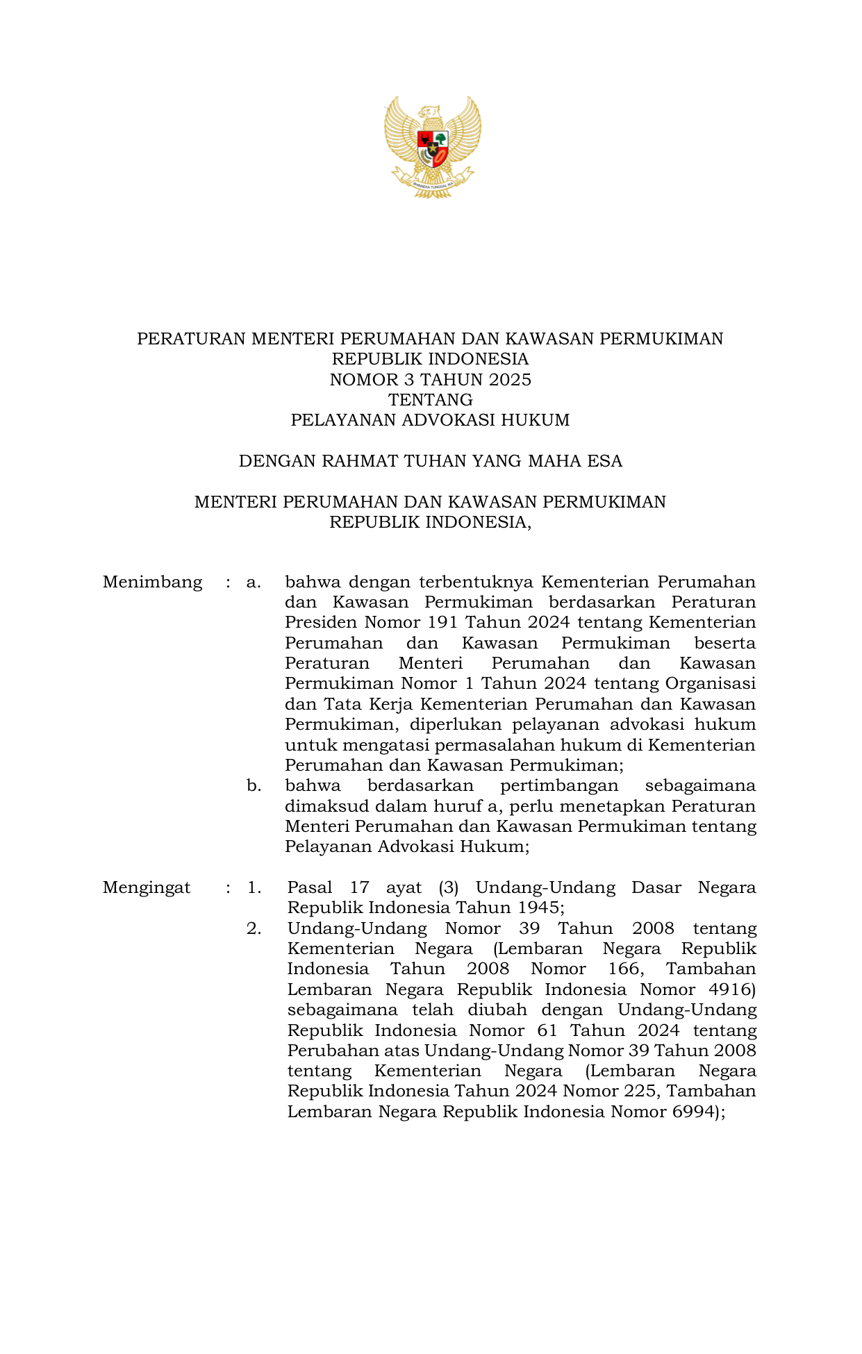 PERMEN Nomor 3 Tahun 2025 | Peraturan Menteri Nomor 3 Tahun 2025 tentang PELAYANAN ADVOKASI HUKUM