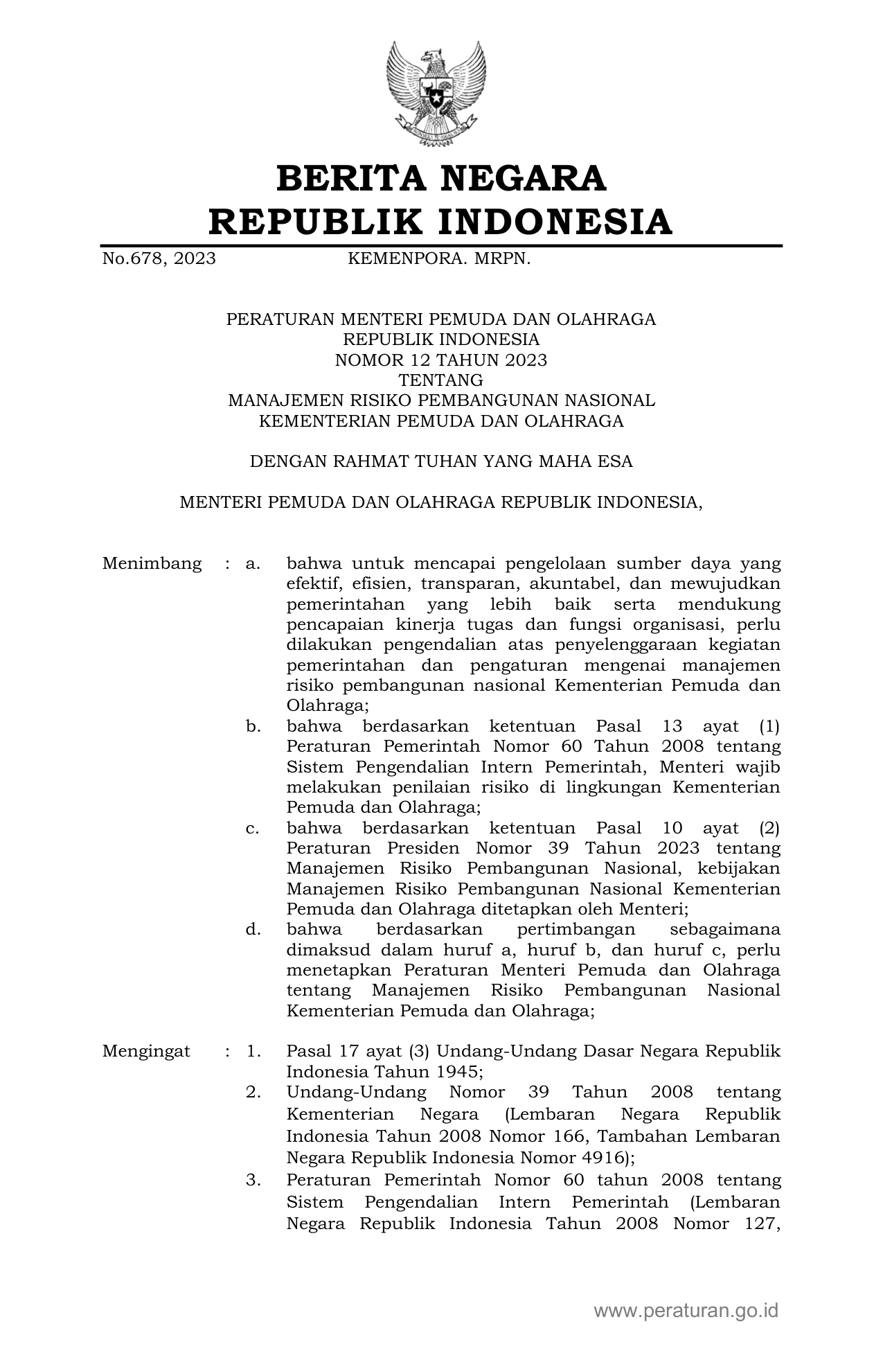 PERMEN Nomor 12 Tahun 2023 | Peraturan Menteri Nomor 12 Tahun 2023 tentang MANAJEMEN RISIKO PEMBANGUNAN NASIONAL KEMENTERIAN PEMUDA DAN OLAHRAGA