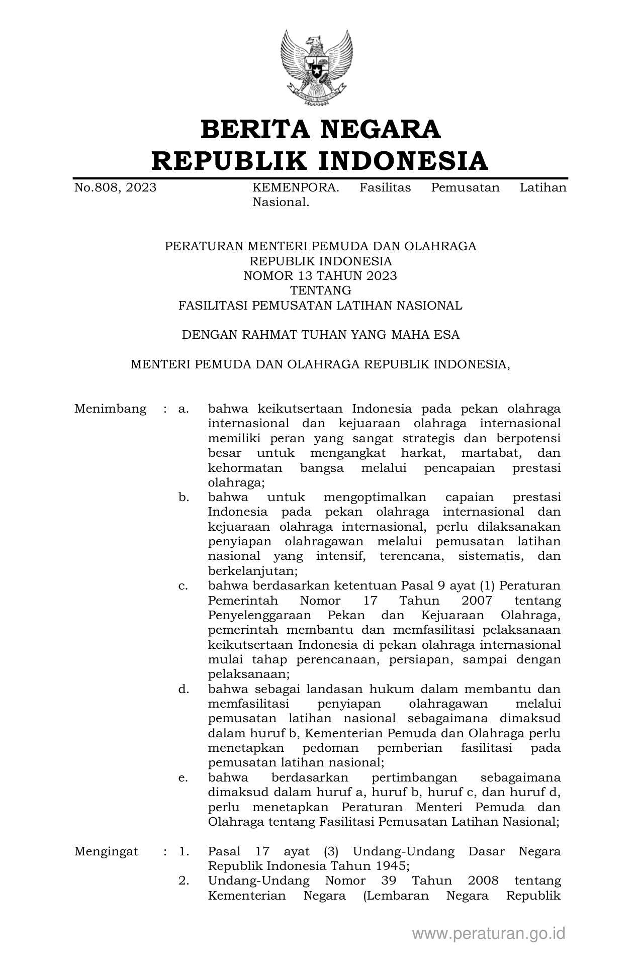 PERMEN Nomor 13 Tahun 2023 | Peraturan Menteri Nomor 13 Tahun 2023 tentang FASILITASI PEMUSATAN LATIHAN NASIONAL