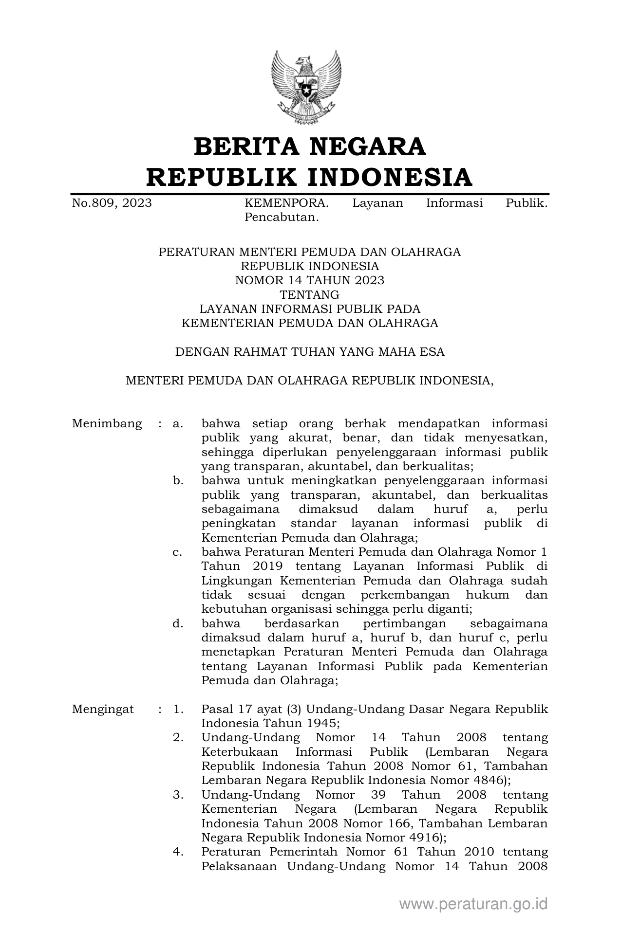 PERMEN Nomor 14 Tahun 2023 | Peraturan Menteri Nomor 14 Tahun 2023 tentang LAYANAN INFORMASI PUBLIK PADA KEMENTERIAN PEMUDA DAN OLAHRAGA