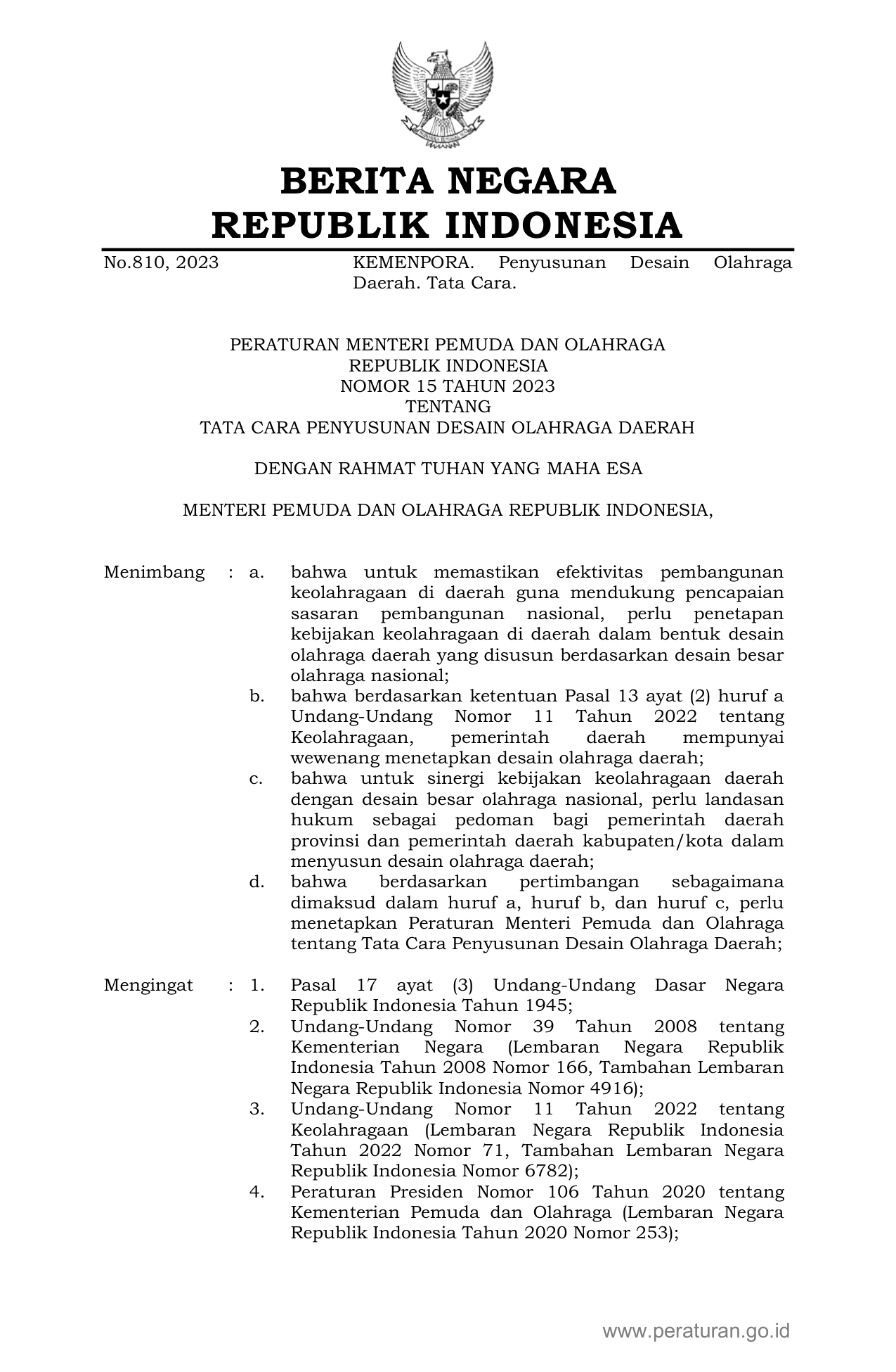 PERMEN Nomor 15 Tahun 2023 | Peraturan Menteri Nomor 15 Tahun 2023 tentang TATA CARA PENYUSUNAN DESAIN OLAHRAGA DAERAH