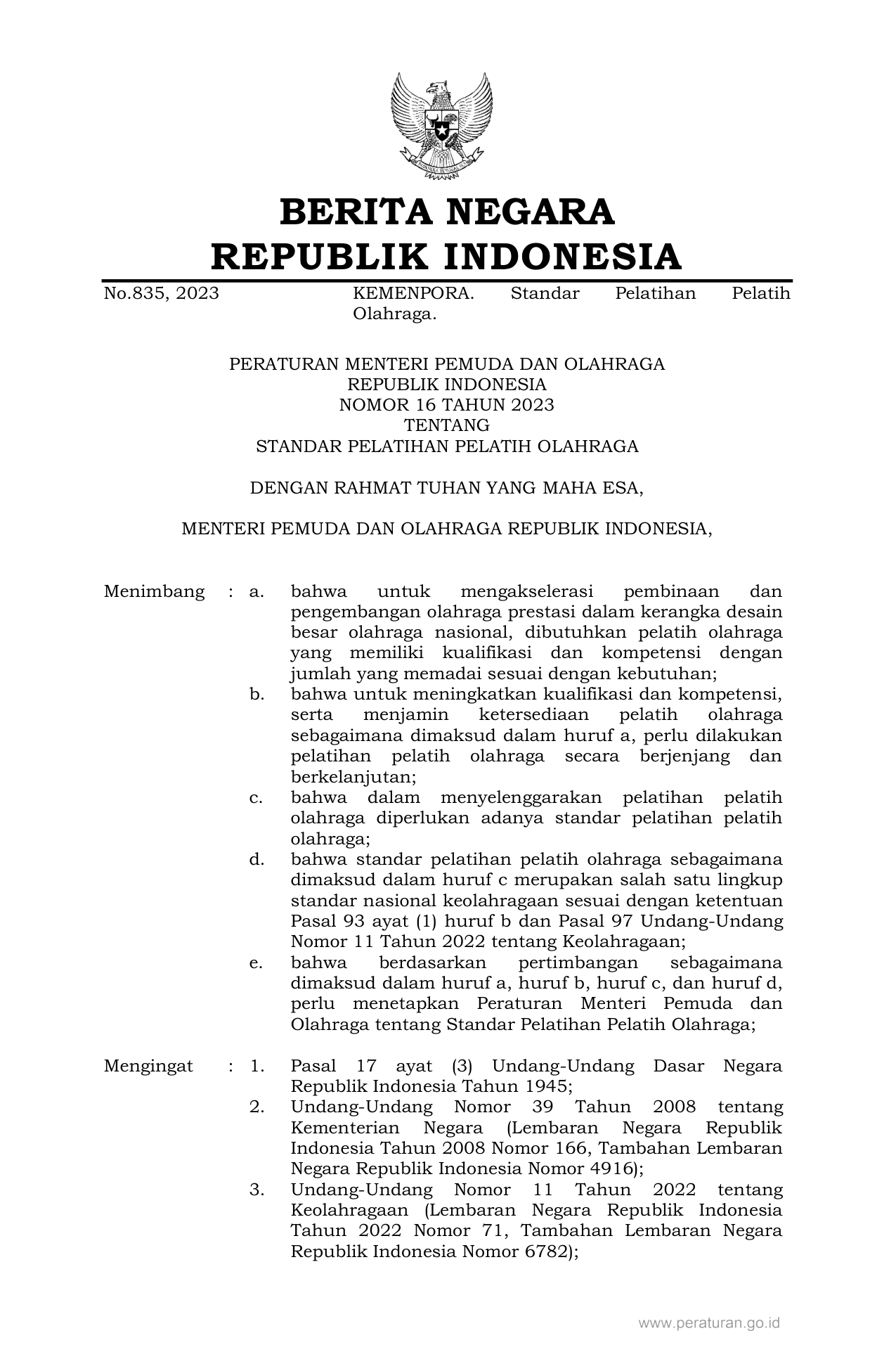 PERMEN Nomor 16 Tahun 2023 | Peraturan Menteri Nomor 16 Tahun 2023 tentang STANDAR PELATIHAN PELATIH OLAHRAGA