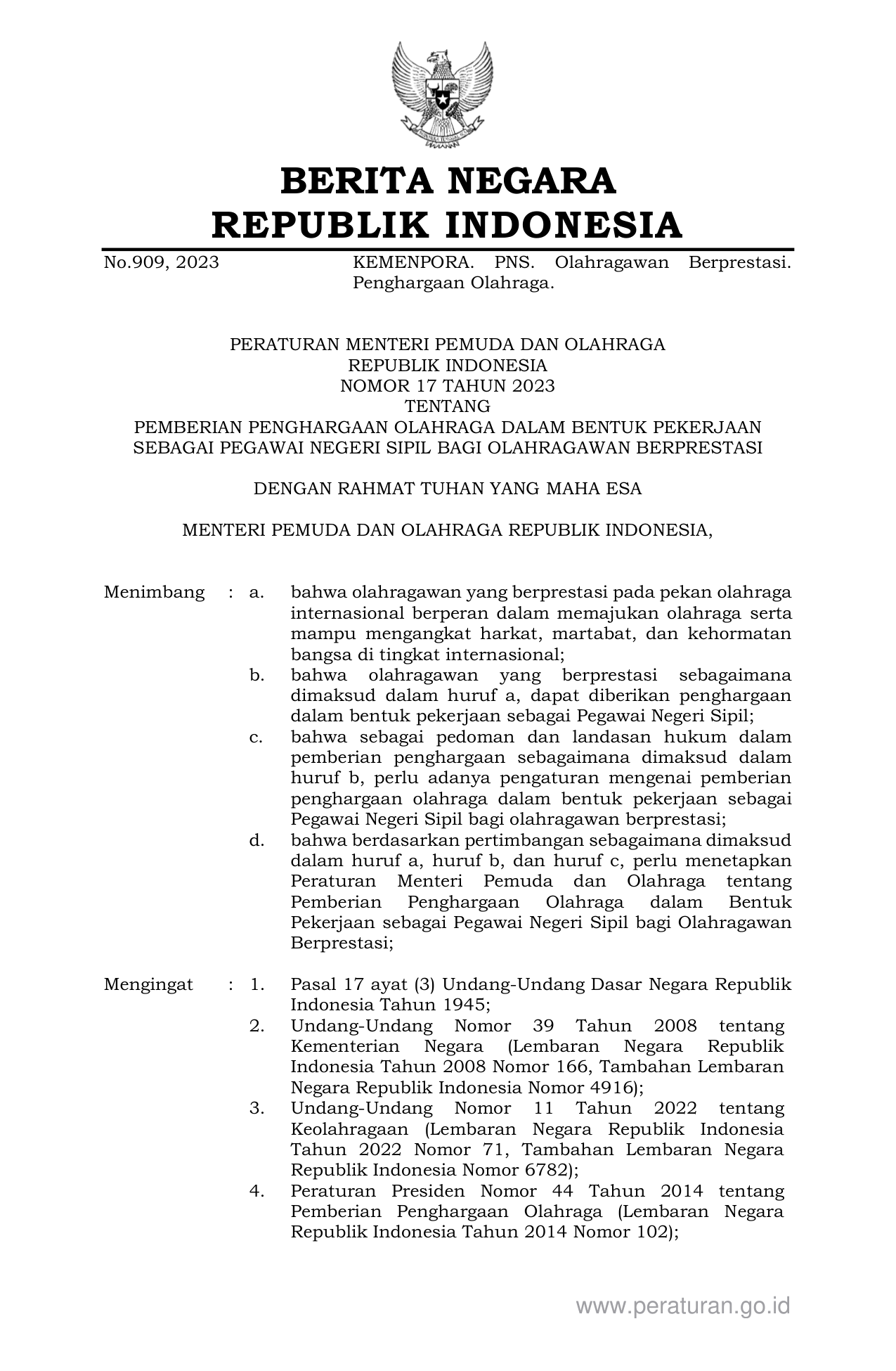 PERMEN Nomor 17 Tahun 2023 | Peraturan Menteri Nomor 17 Tahun 2023 tentang PEMBERIAN PENGHARGAAN OLAHRAGA DALAM BENTUK PEKERJAAN SEBAGAI PEGAWAI NEGERI SIPIL BAGI OLAHRAGAWAN BERPRESTASI