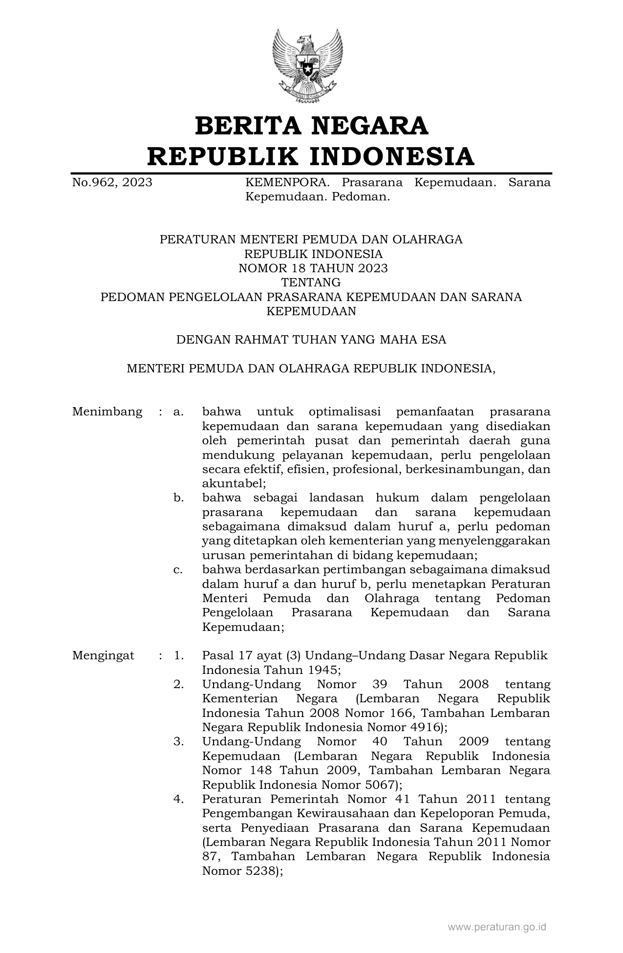 PERMEN Nomor 18 Tahun 2023 | Peraturan Menteri Nomor 18 Tahun 2023 tentang PEDOMAN PENGELOLAAN PRASARANA KEPEMUDAAN DAN SARANA KEPEMUDAAN