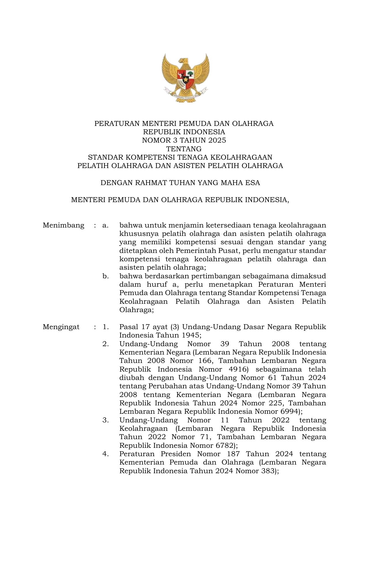 PERMEN Nomor 3 Tahun 2025 | Peraturan Menteri Nomor 3 Tahun 2025 tentang Standar Kompetensi Tenaga Keolahragaan Pelatih Olahraga dan Asisten Pelatih Olahraga