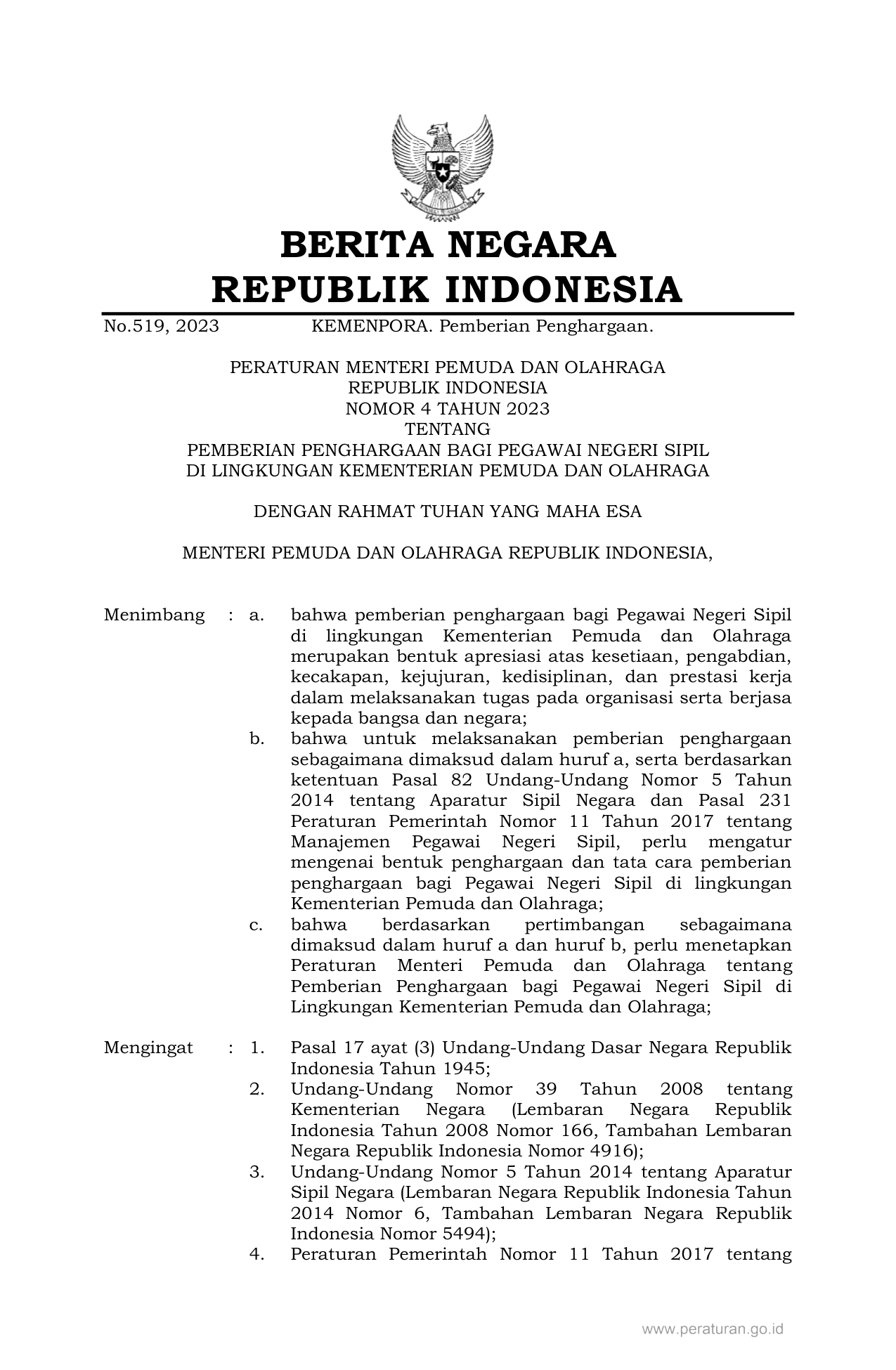 PERMEN Nomor 4 Tahun 2023 | Peraturan Menteri Nomor 4 Tahun 2023 tentang PEMBERIAN PENGHARGAAN BAGI PEGAWAI NEGERI SIPIL DI LINGKUNGAN KEMENTERIAN PEMUDA DAN OLAHRAGA