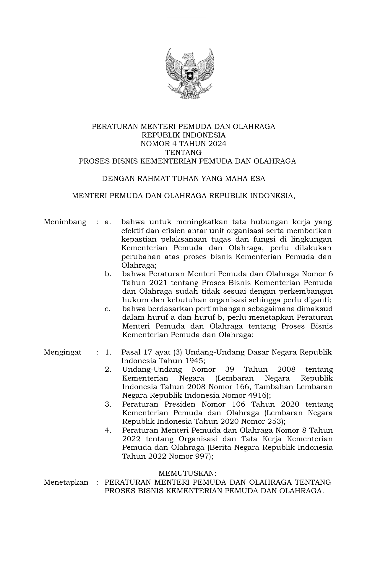 PERMEN Nomor 4 Tahun 2024 | Peraturan Menteri Nomor 4 Tahun 2024 tentang PROSES BISNIS KEMENTERIAN PEMUDA DAN OLAHRAGA