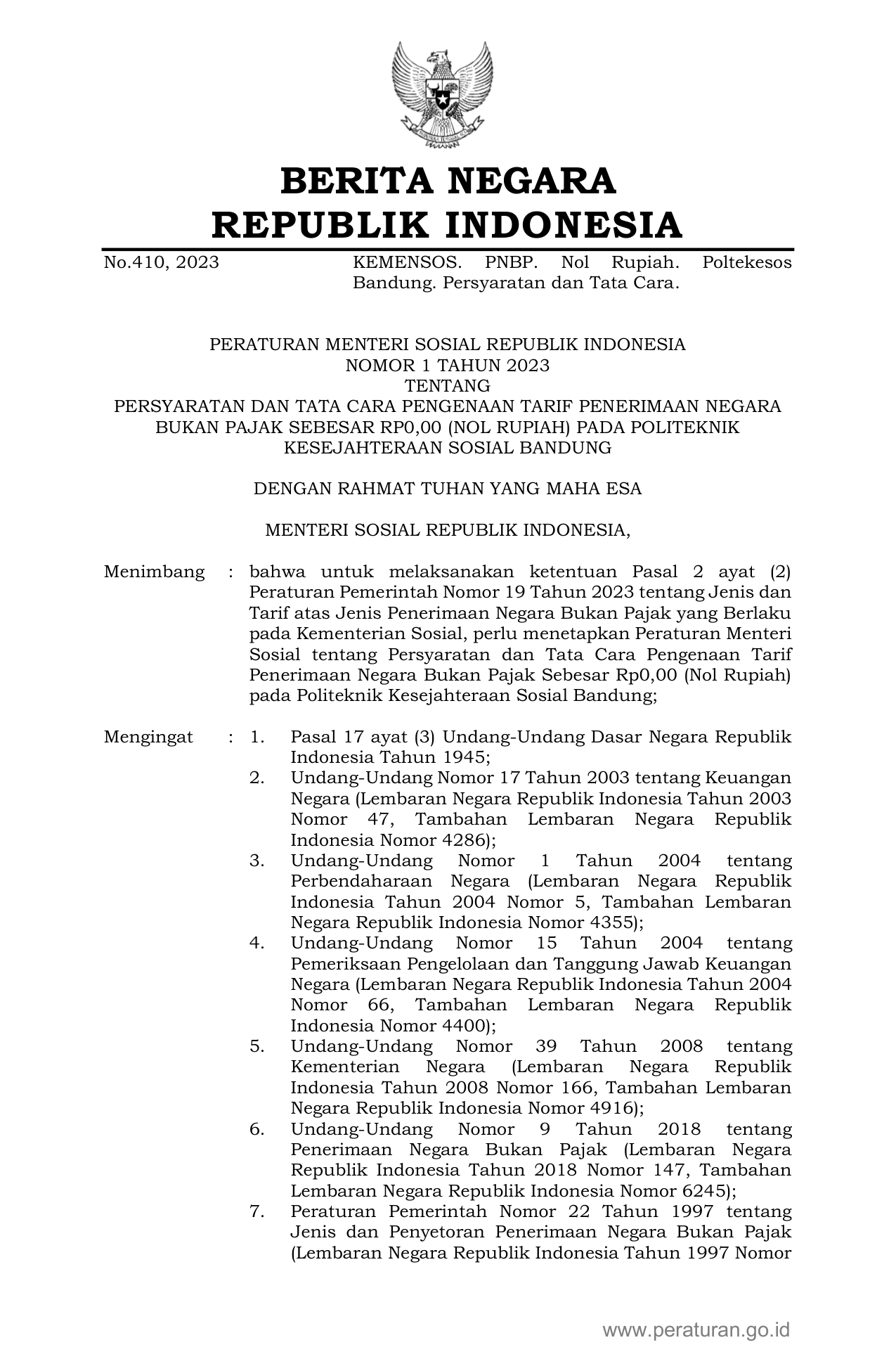 PERMEN Nomor 1 Tahun 2023 | Peraturan Menteri Nomor 1 Tahun 2023 tentang PERSYARATAN DAN TATA CARA PENGENAAN TARIF PENERIMAAN NEGARA BUKAN PAJAK SEBESAR RP0,00 (NOL RUPIAH) PADA POLITEKNIK KESEJAHTERAAN SOSIAL BANDUNG