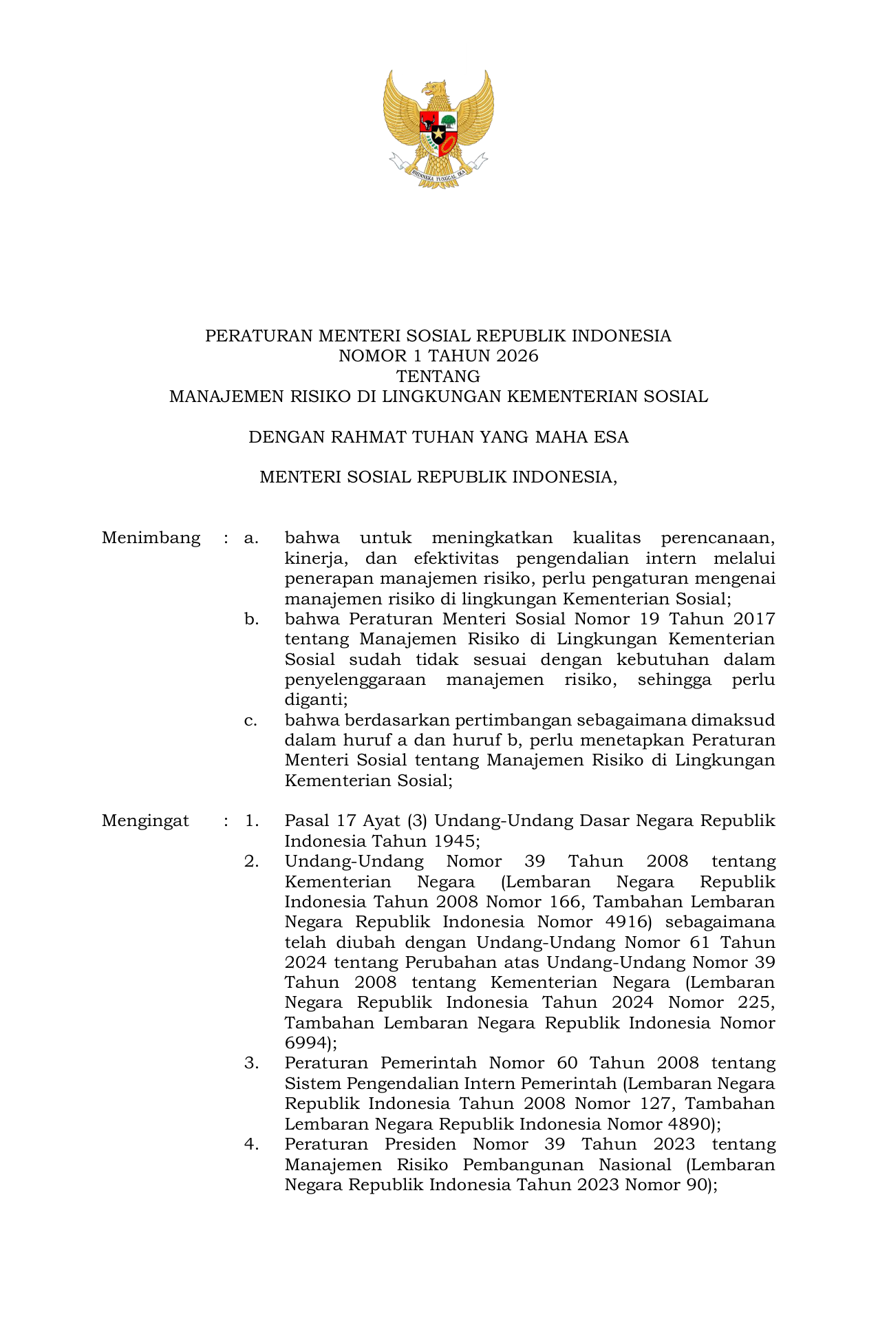 PERMEN Nomor 1 Tahun 2026 | Peraturan Menteri Nomor 1 Tahun 2026 tentang Manajemen Risiko di Lingkungan Kementerian Sosial