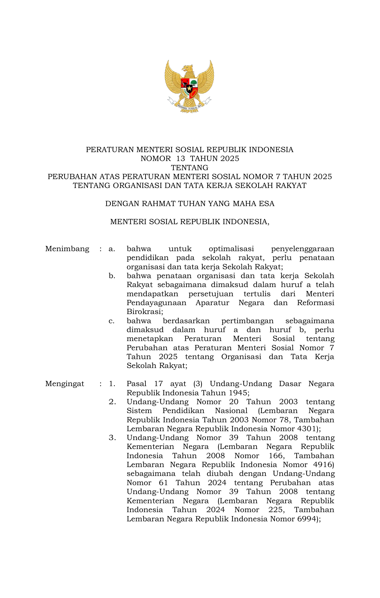 PERMEN Nomor 13 Tahun 2025 | Peraturan Menteri Nomor 13 Tahun 2025 tentang Perubahan atas Peraturan Menteri Sosial Nomor 7 Tahun 2025 tentang Organisasi dan Tata Kerja Sekolah Rakyat