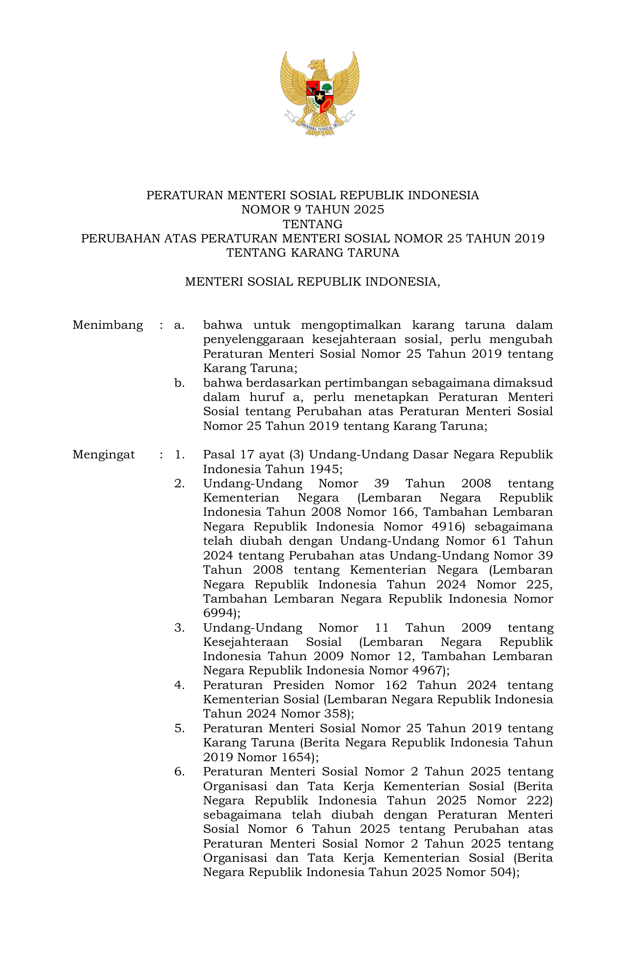 PERMEN Nomor 9 Tahun 2025 | Peraturan Menteri Nomor 9 Tahun 2025 tentang Perubahan atas Peraturan Menteri Sosial Nomor 25 Tahun 2019 tentang Karang Taruna