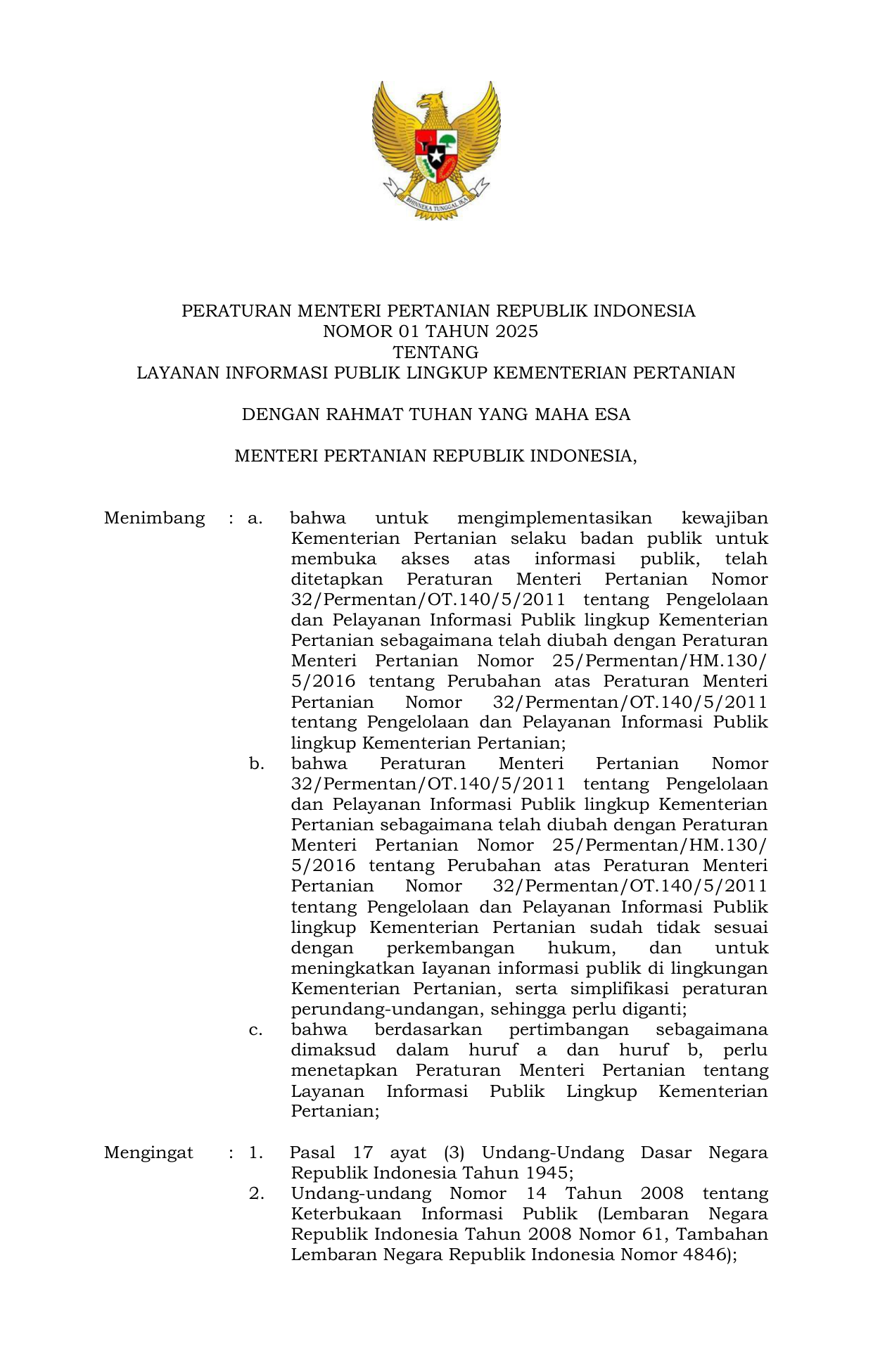 PERMEN Nomor 01 Tahun 2025 | Peraturan Menteri Nomor 01 Tahun 2025 tentang Layanan Informasi Publik Lingkup Kementerian Pertanian