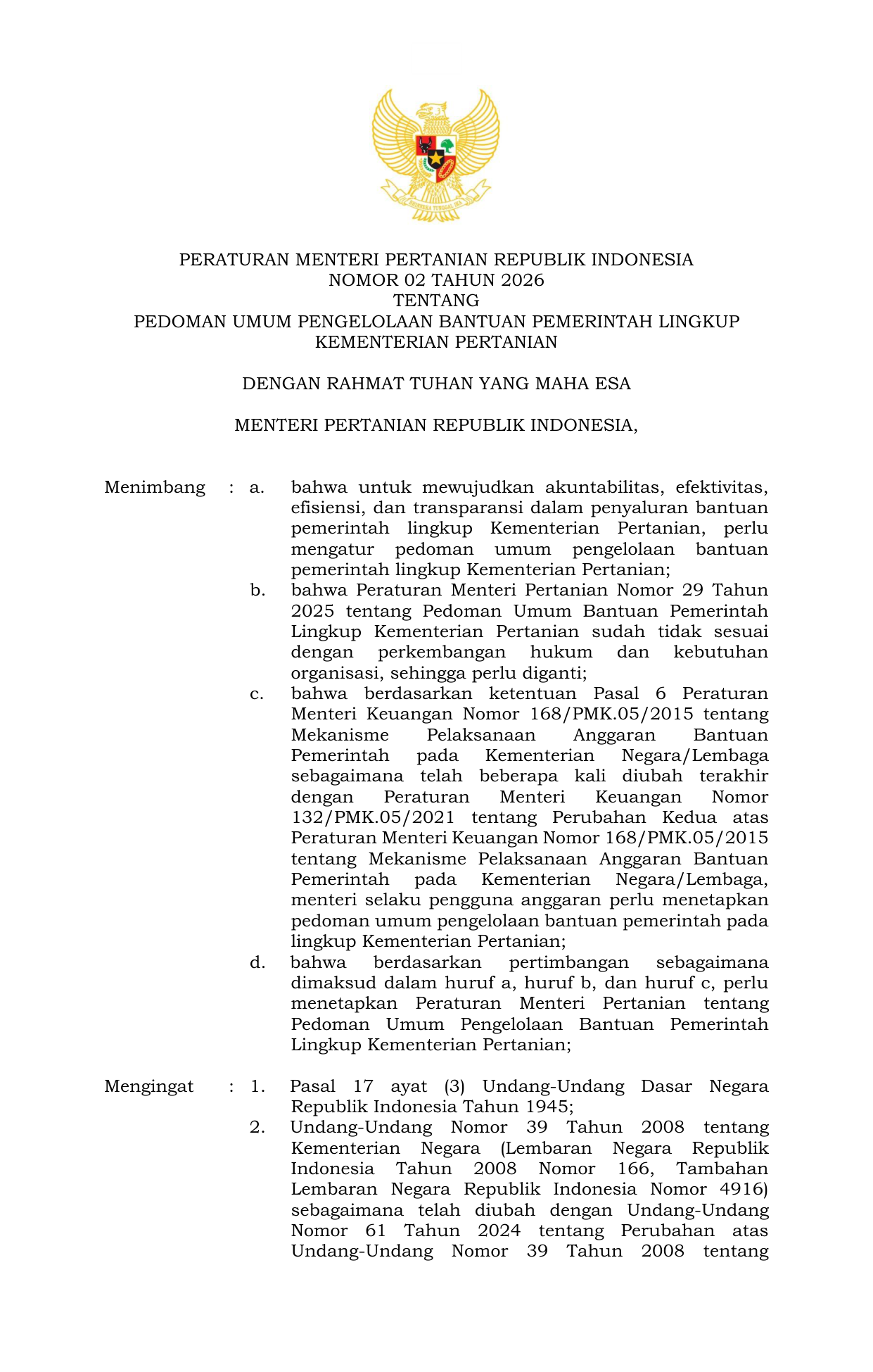 PERMEN Nomor 02 Tahun 2026 | Peraturan Menteri Nomor 02 Tahun 2026 tentang Pedoman Umum Pengelolaan Bantuan Pemerintah Lingkup Kementerian Pertanian