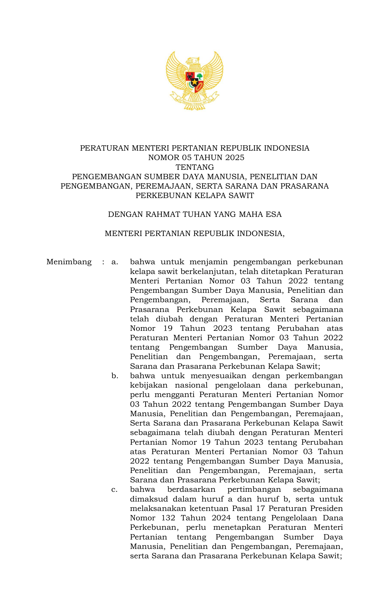 PERMEN Nomor 05 Tahun 2025 | Peraturan Menteri Nomor 05 Tahun 2025 tentang Pengembangan Sumber Daya Manusia Penelitian dan Pengembangan Peremajaan serta Sarana dan Prasarana Perkebunan Kelapa Sawit