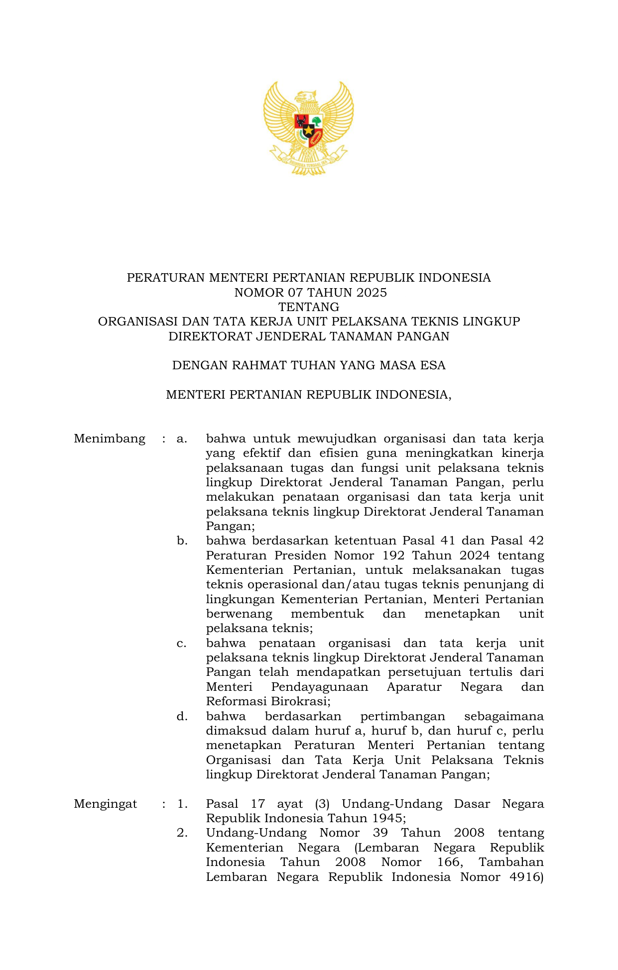 PERMEN Nomor 07 Tahun 2025 | Peraturan Menteri Nomor 07 Tahun 2025 tentang Organisasi dan Tata Kerja Unit Pelaksana Teknis lingkup Direktorat Jenderal Tanaman Pangan