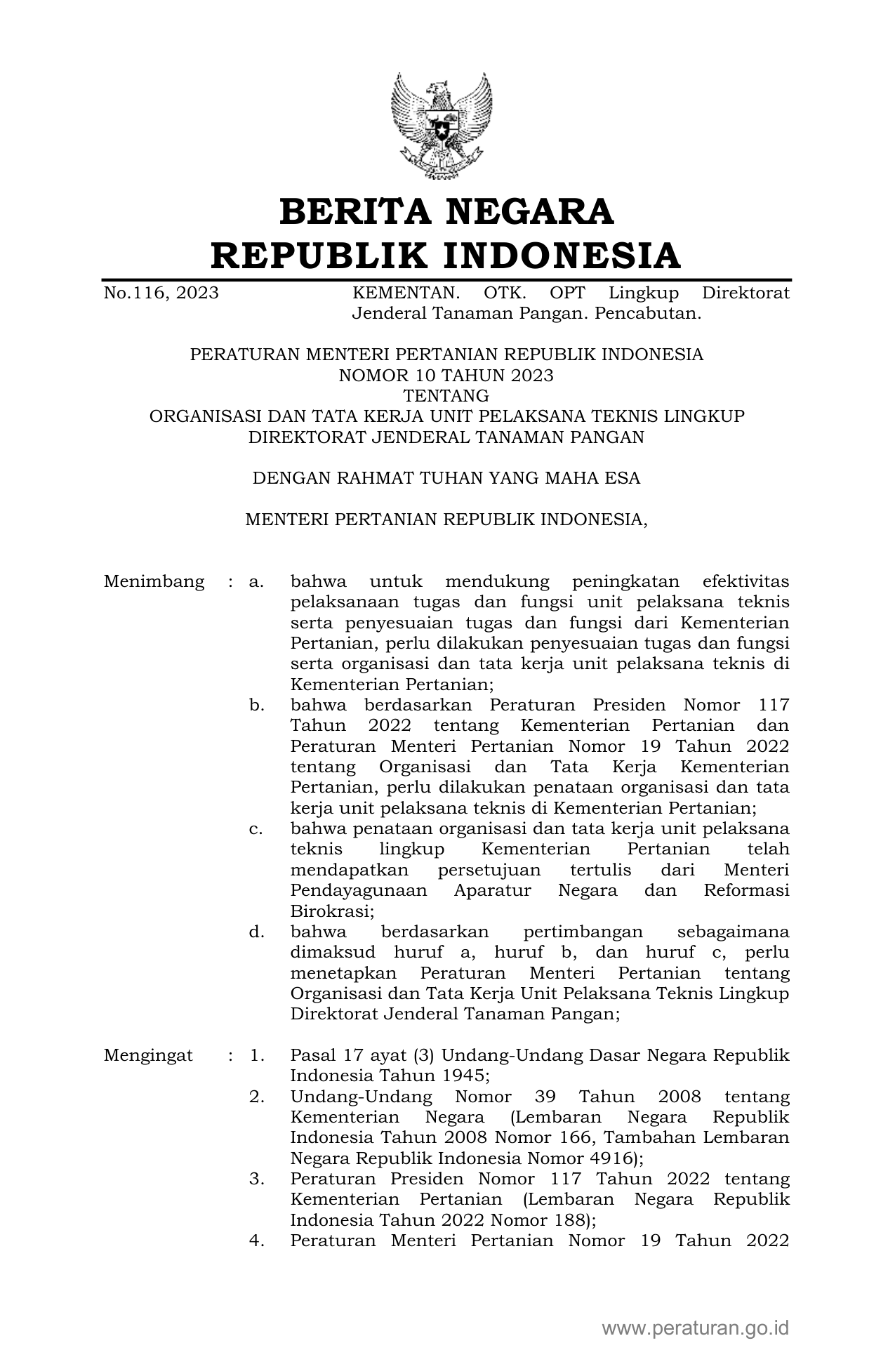 PERMEN Nomor 10 Tahun 2023 | Peraturan Menteri Nomor 10 Tahun 2023 tentang ORGANISASI DAN TATA KERJA UNIT PELAKSANA TEKNIS LINGKUP DIREKTORAT JENDERAL TANAMAN PANGAN