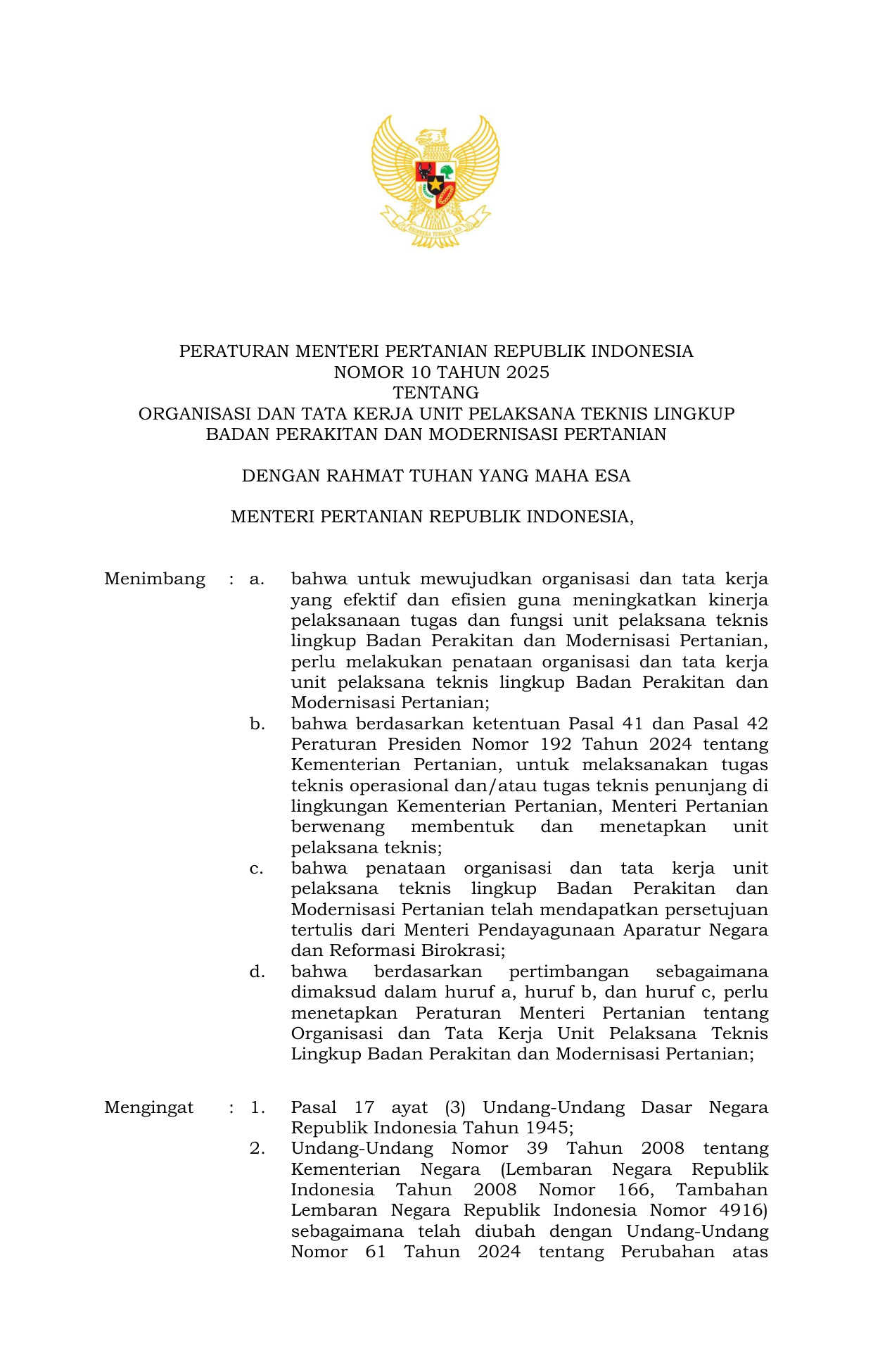 PERMEN Nomor 10 Tahun 2025 | Peraturan Menteri Nomor 10 Tahun 2025 tentang Organisasi dan Tata Kerja Unit Pelaksana Teknis lingkup Badan Perakitan dan Modernisasi Pertanian