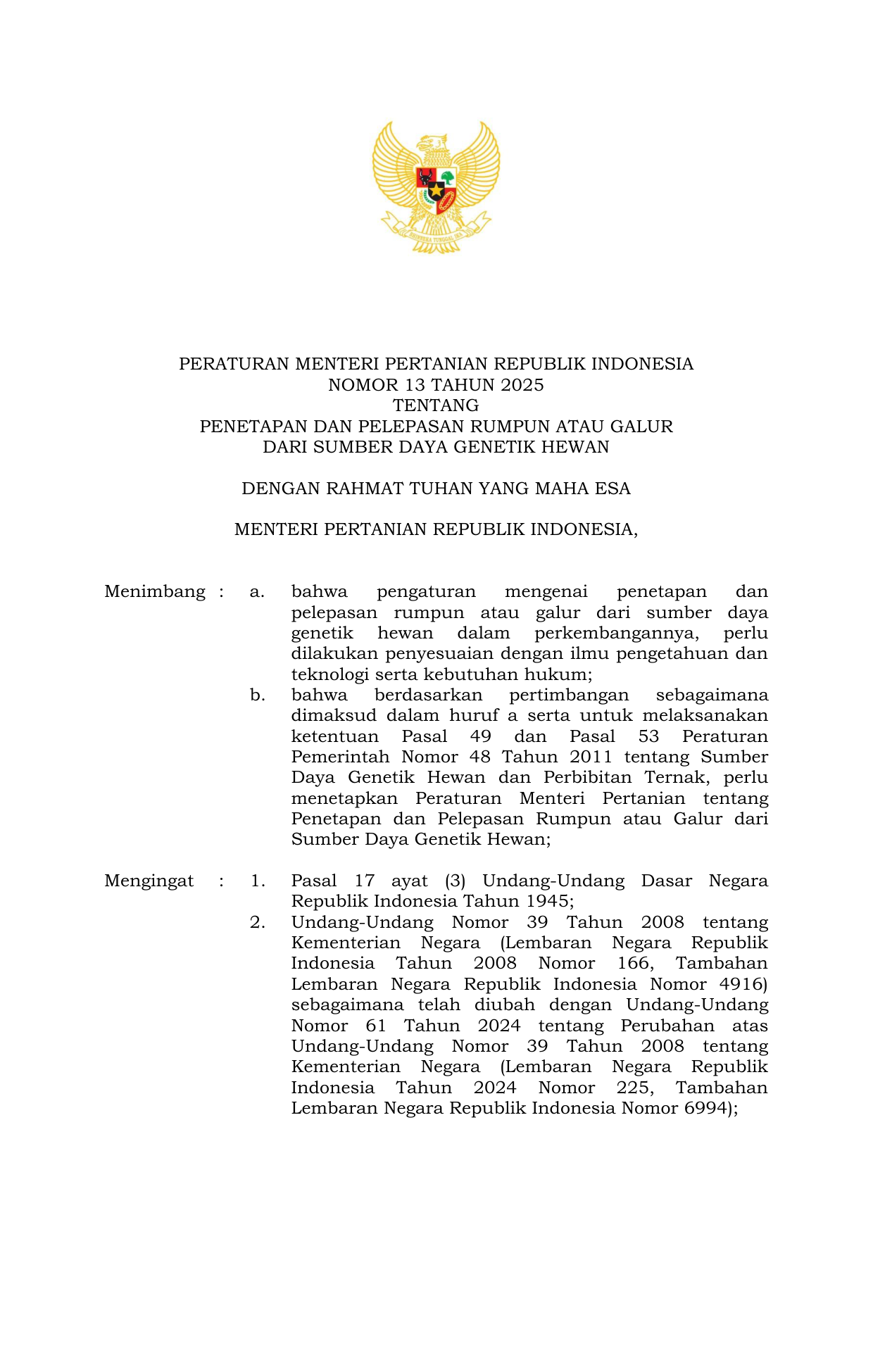 PERMEN Nomor 13 Tahun 2025 | Peraturan Menteri Nomor 13 Tahun 2025 tentang Penetapan dan Pelepasan Rumpun atau Galur dari Sumber Daya Genetik Hewan