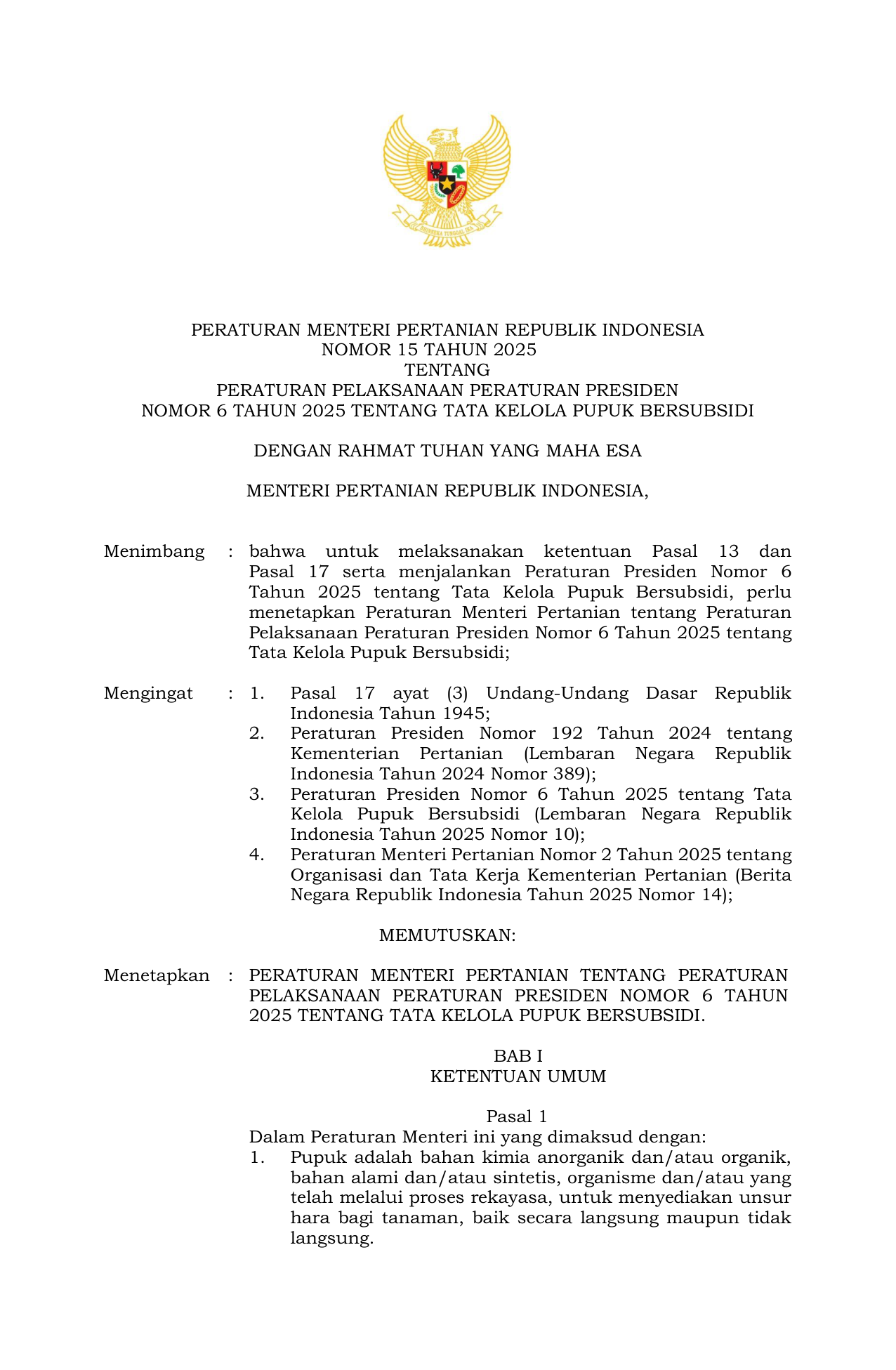 PERMEN Nomor 15 Tahun 2025 | Peraturan Menteri Nomor 15 Tahun 2025 tentang Peraturan Pelaksanaan Peraturan Presiden Nomor 6 Tahun 2025 tentang Tata Kelola Pupuk Bersubsidi