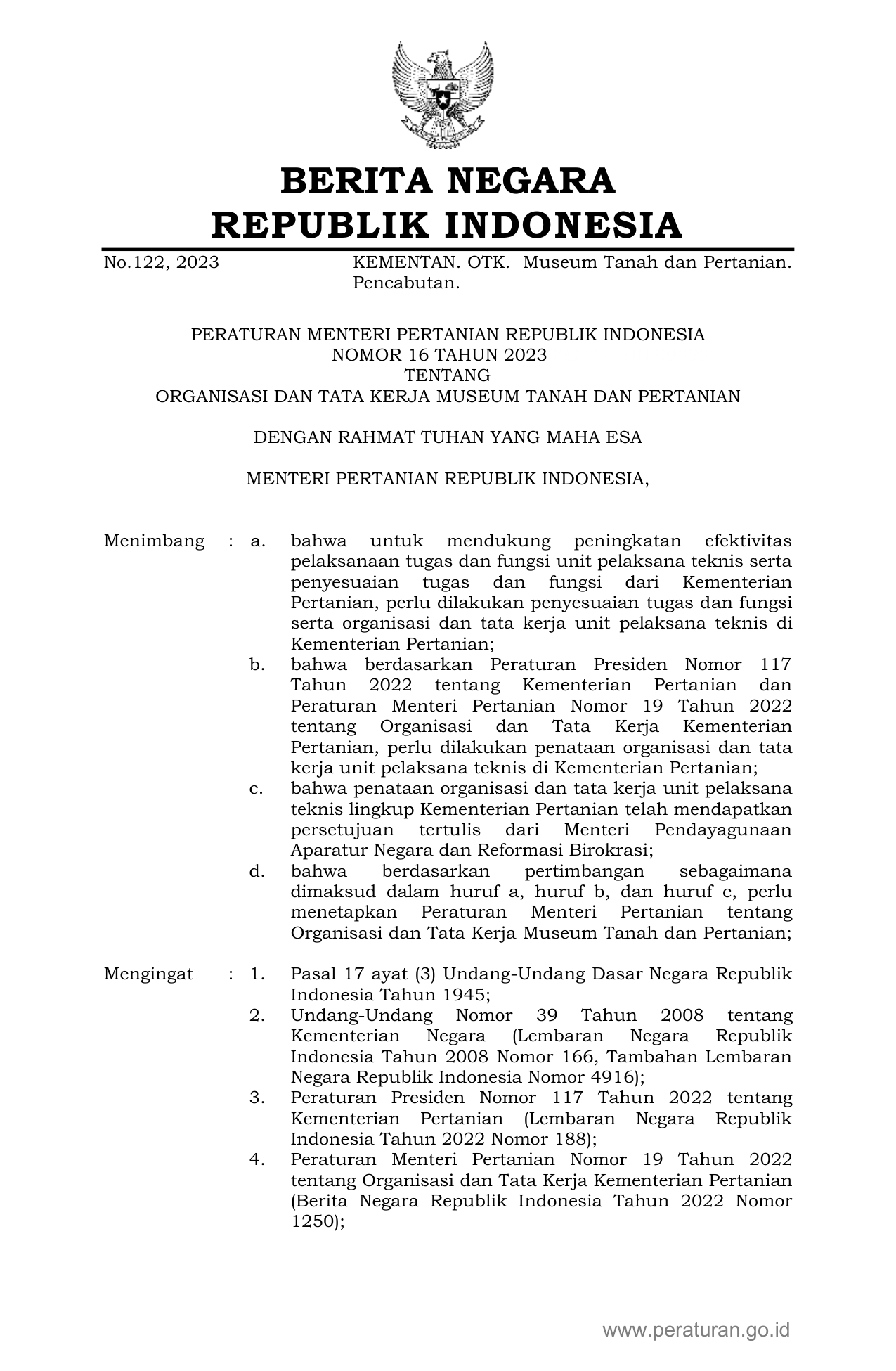 PERMEN Nomor 16 Tahun 2023 | Peraturan Menteri Nomor 16 Tahun 2023 tentang ORGANISASI DAN TATA KERJA MUSEUM TANAH DAN PERTANIAN