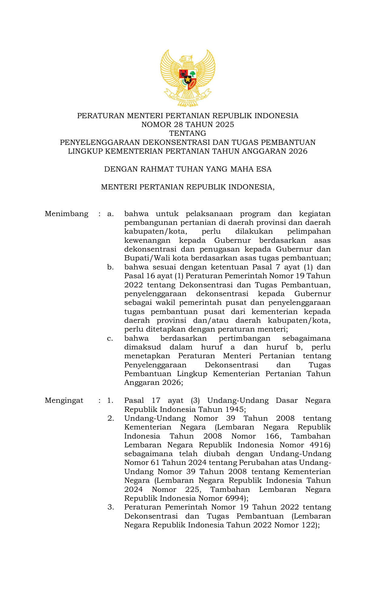 PERMEN Nomor 28 Tahun 2025 | Peraturan Menteri Nomor 28 Tahun 2025 tentang Pengelolaan Dana Dekonsentrasi dan Dana Tugas Pembantuan Lingkup Kementerian Pertanian Tahun Anggaran 2026