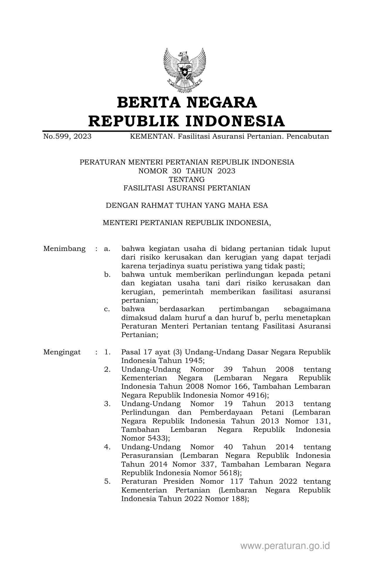 PERMEN Nomor 30 Tahun 2023 | Peraturan Menteri Nomor 30 Tahun 2023 tentang FASILITASI ASURANSI PERTANIAN