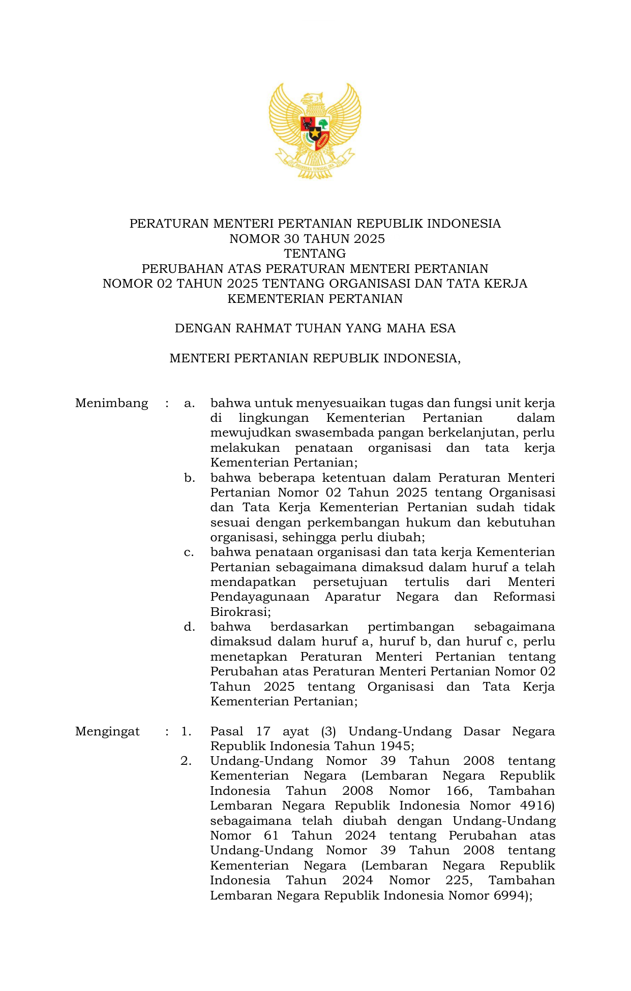 PERMEN Nomor 30 Tahun 2025 | Peraturan Menteri Nomor 30 Tahun 2025 tentang Perubahan atas Peraturan Menteri Pertanian Nomor 02 Tahun 2025 tentang Organisasi dan Tata Kerja Kementerian Pertanian