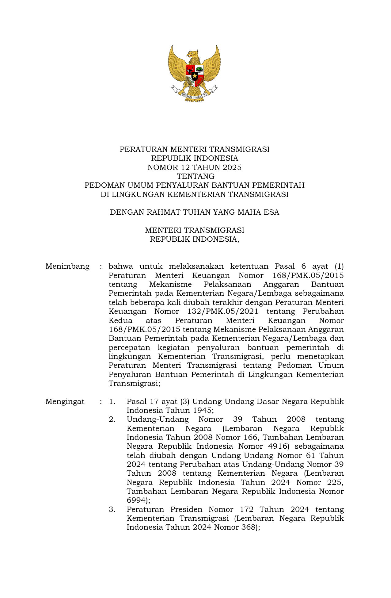 PERMEN Nomor 12 Tahun 2025 | Peraturan Menteri Nomor 12 Tahun 2025 tentang Pedoman Umum Penyaluran Bantuan Pemerintah di Lingkungan Kementerian Transmigrasi