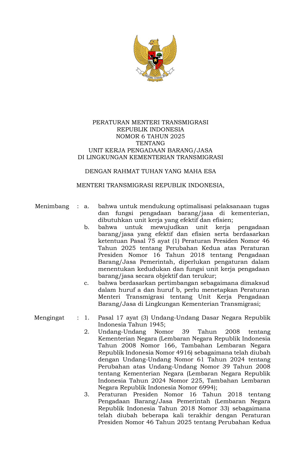 PERMEN Nomor 6 Tahun 2025 | Peraturan Menteri Nomor 6 Tahun 2025 tentang Unit Kerja Pengadaan Barang atau Jasa di Lingkungan Kementerian Transmigrasi