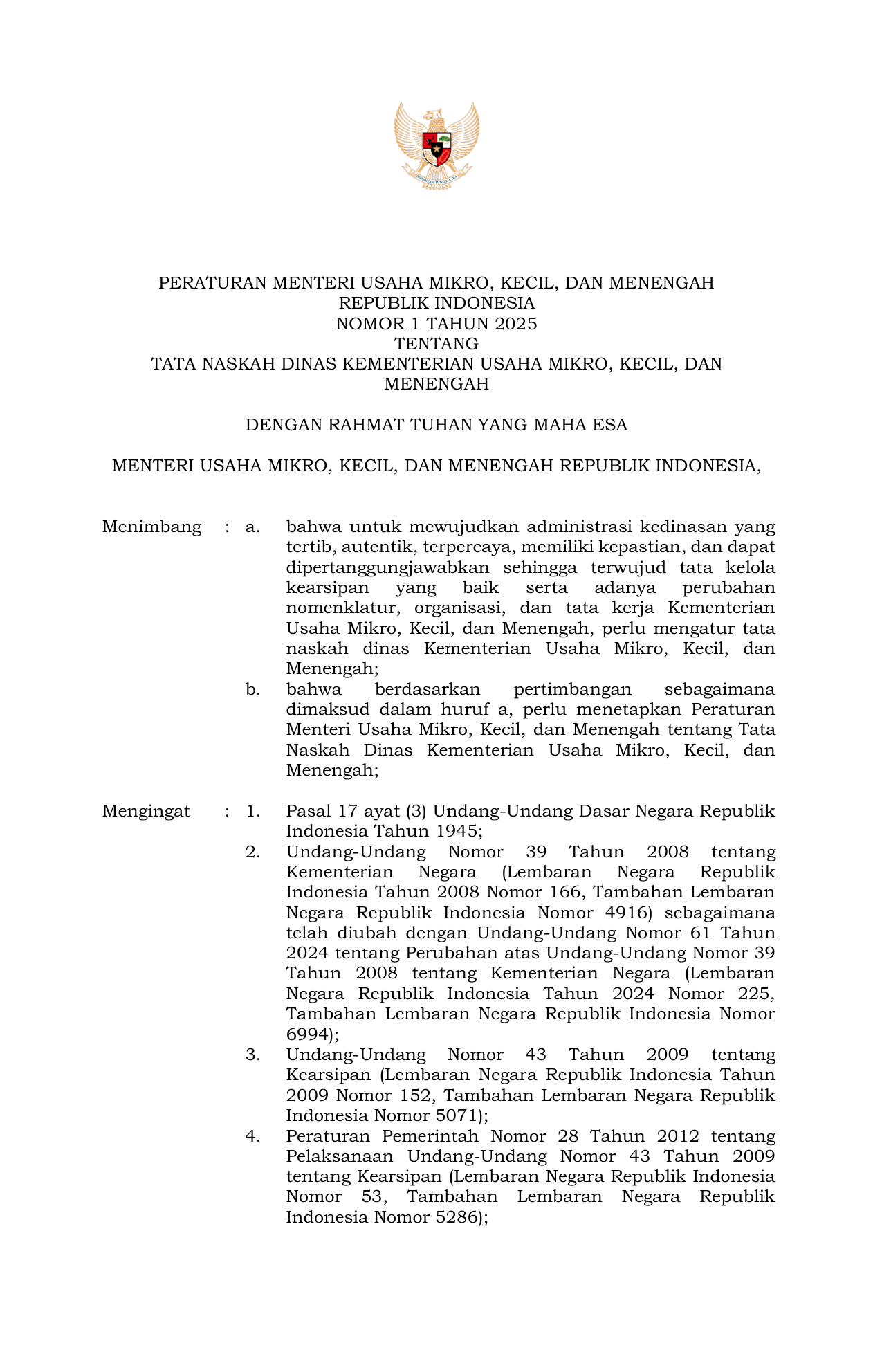 PERMEN Nomor 1 Tahun 2025 | Peraturan Menteri Nomor 1 Tahun 2025 tentang TATA NASKAH DINAS KEMENTERIAN USAHA MIKRO KECIL DAN MENENGAH