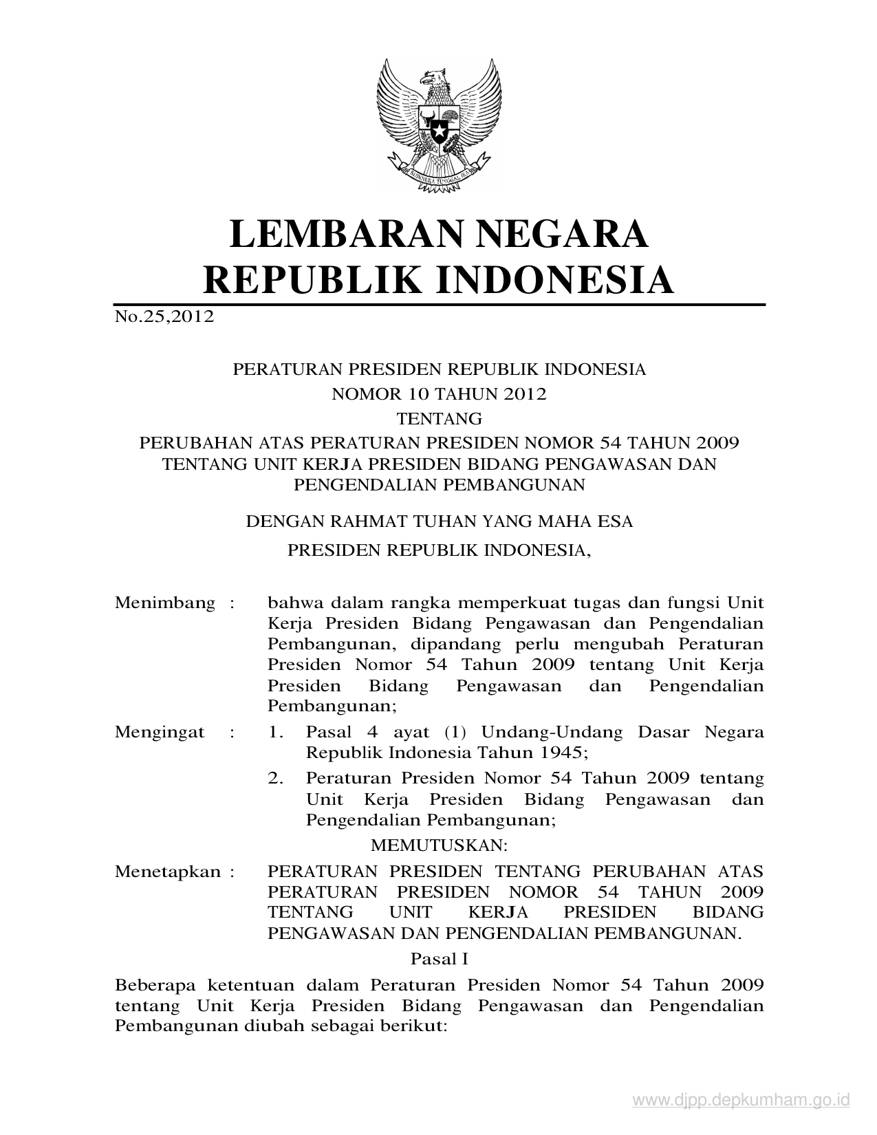 PERPRES Nomor 10 Tahun 2012 | Peraturan Presiden Nomor 10 Tahun 2012 tentang PERUBAHAN ATAS PERATURAN PRESIDEN NOMOR 54 TAHUN 2009 TENTANG UNIT KERJA PRESIDEN BIDANG PENGAWASAN DAN PENGENDALIAN PEMBANGUNAN