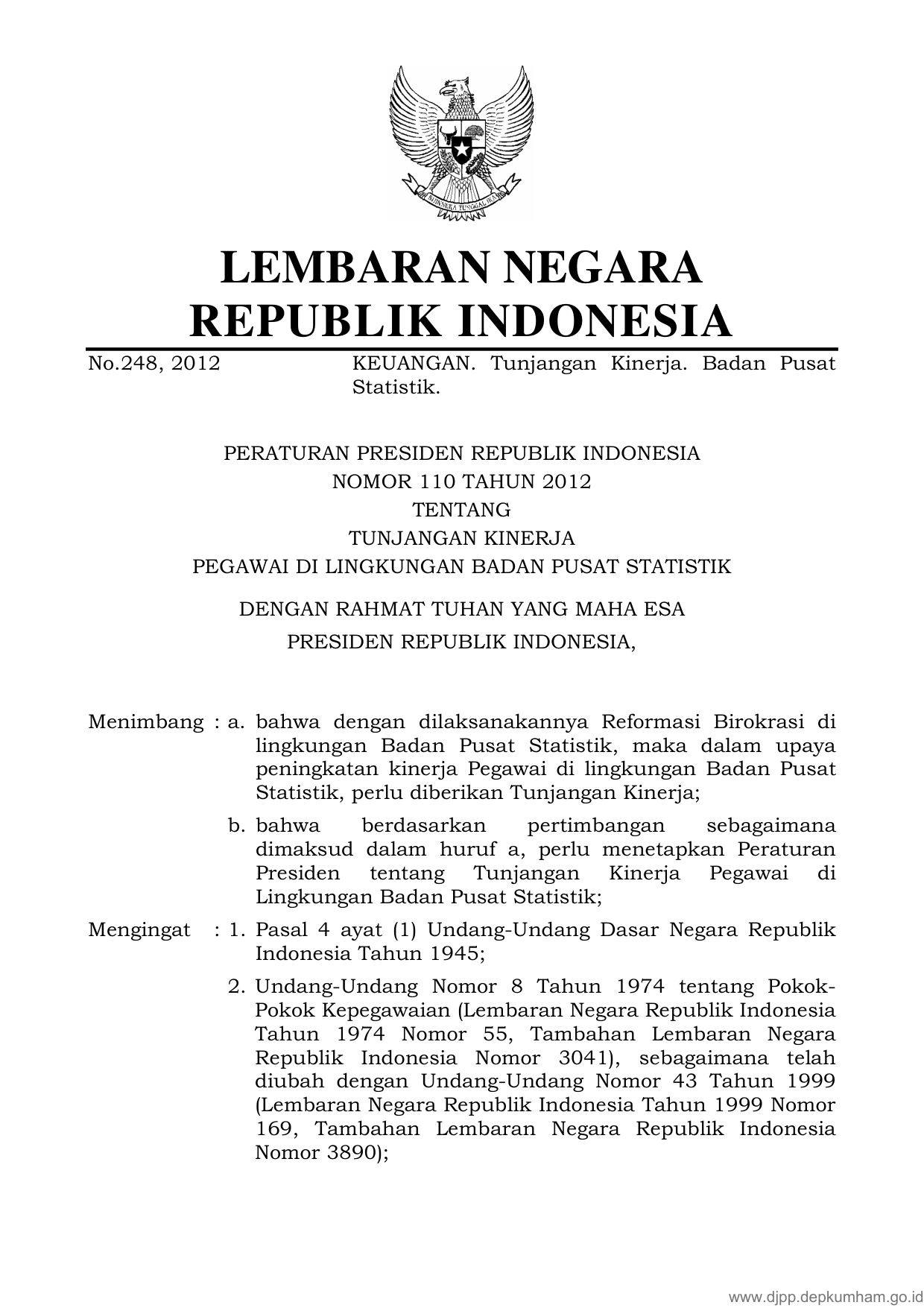 PERPRES Nomor 110 Tahun 2012 | Peraturan Presiden Nomor 110 Tahun 2012 tentang TUNJANGAN KINERJA PEGAWAI DI LINGKUNGAN BADAN PUSAT STATISTIK