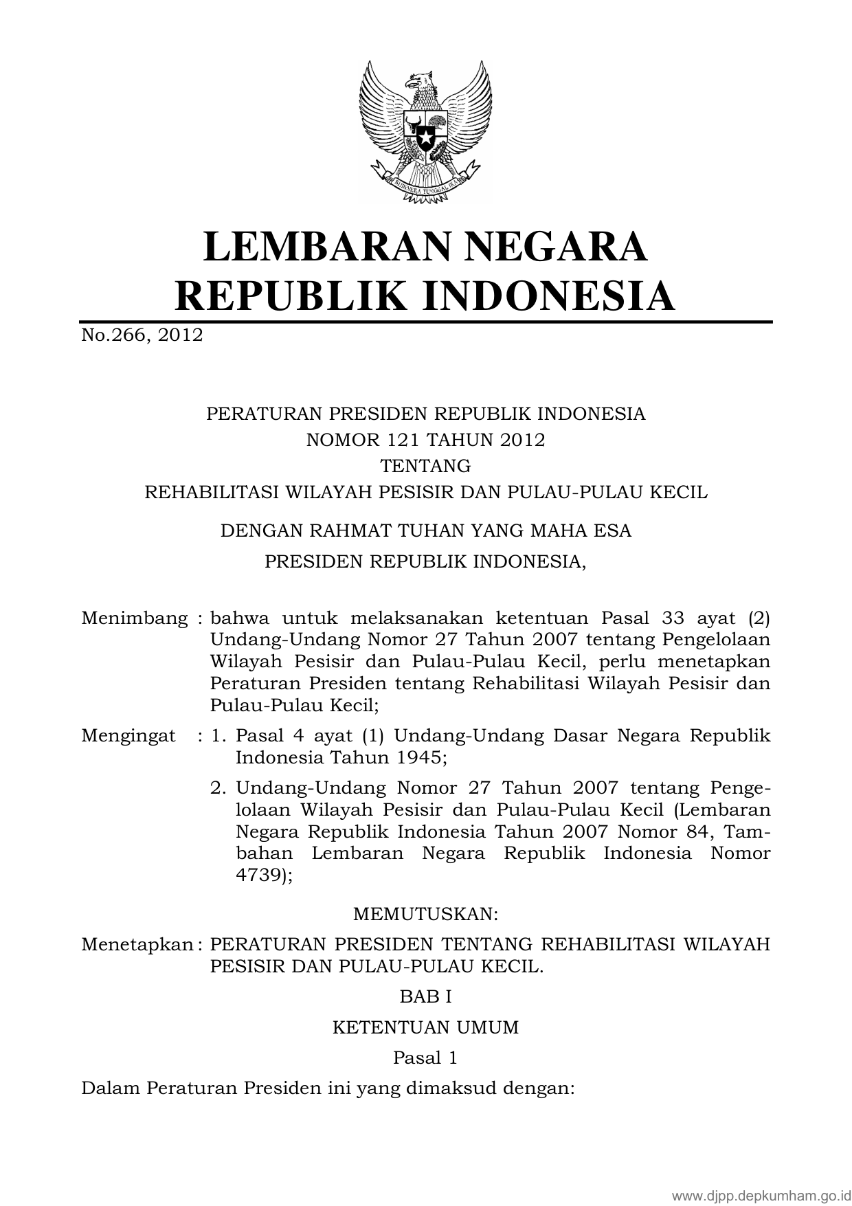 PERPRES Nomor 121 Tahun 2012 | Peraturan Presiden Nomor 121 Tahun 2012 tentang REHABILITASI WILAYAH PESISIR DAN PULAU-PULAU KECIL
