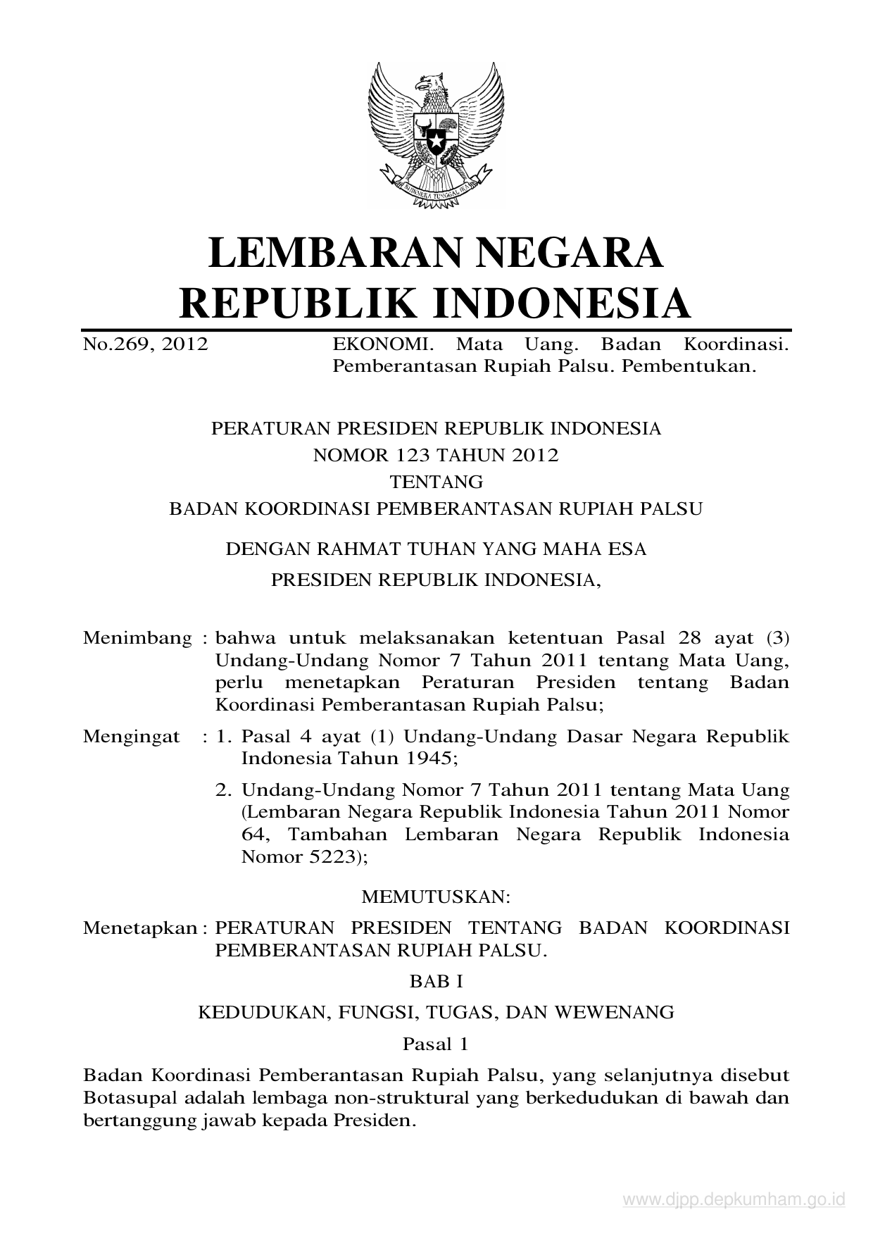 PERPRES Nomor 123 Tahun 2012 | Peraturan Presiden Nomor 123 Tahun 2012 tentang BADAN KOORDINASI PEMBERANTASAN RUPIAH PALSU