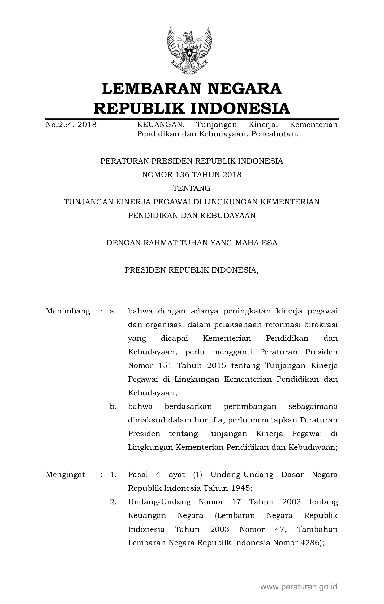 PERPRES Nomor 136 Tahun 2018 | Peraturan Presiden Nomor 136 Tahun 2018 tentang Tunjangan Kinerja Pegawai di Lingkungan Kementerian Pendidikan dan Kebudayaan