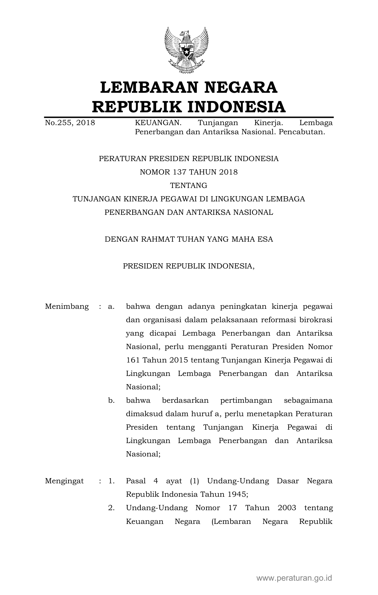 PERPRES Nomor 137 Tahun 2018 | Peraturan Presiden Nomor 137 Tahun 2018 tentang Tunjangan Kinerja Pegawai di Lingkungan Lembaga Penerbangan dan Antariksa Nasional