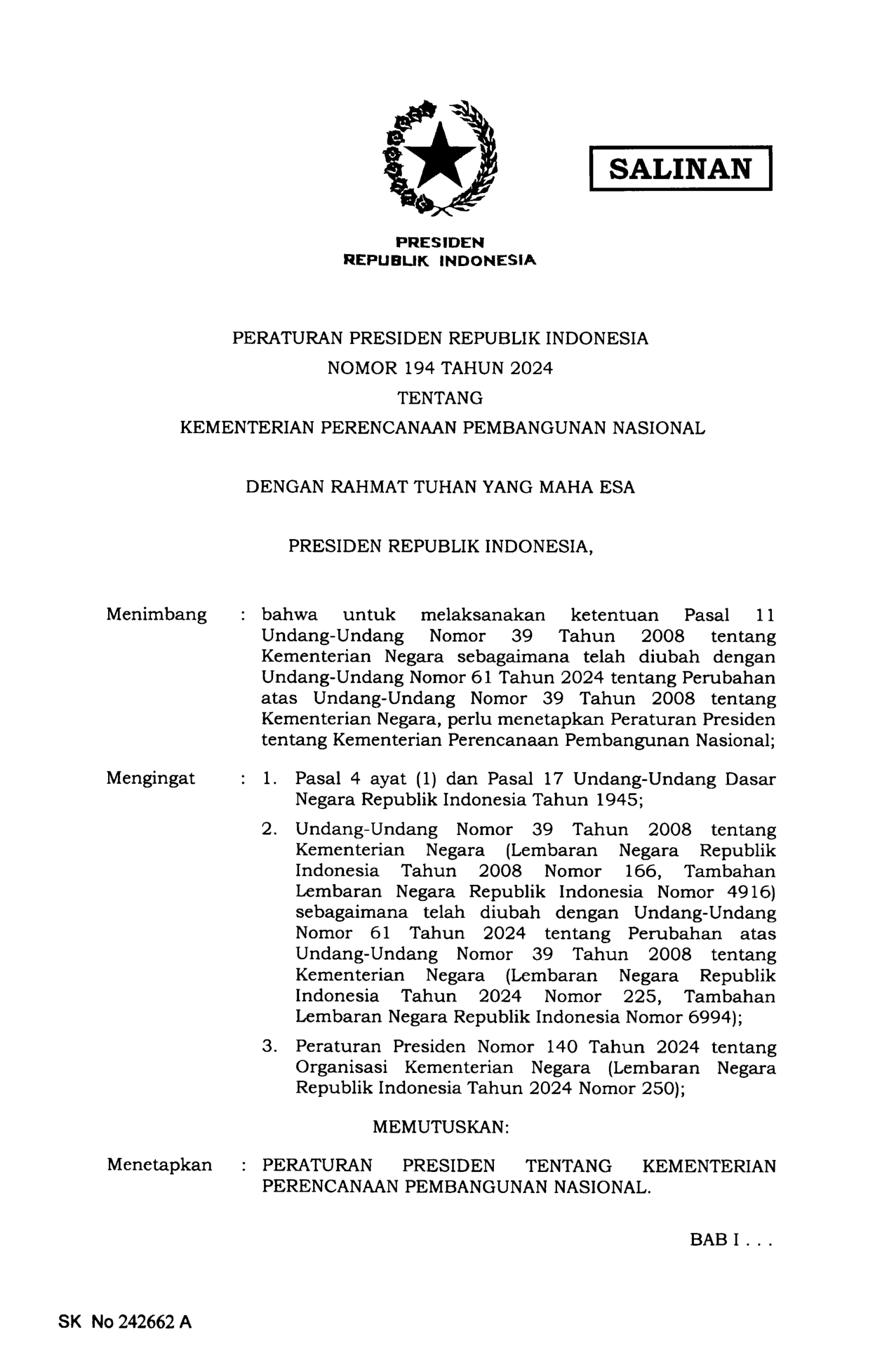 PERPRES Nomor 194 Tahun 2024 | Peraturan Presiden Nomor 194 Tahun 2024 tentang KEMENTERIAN PERENCANAAN PEMBANGUNAN NASIONAL