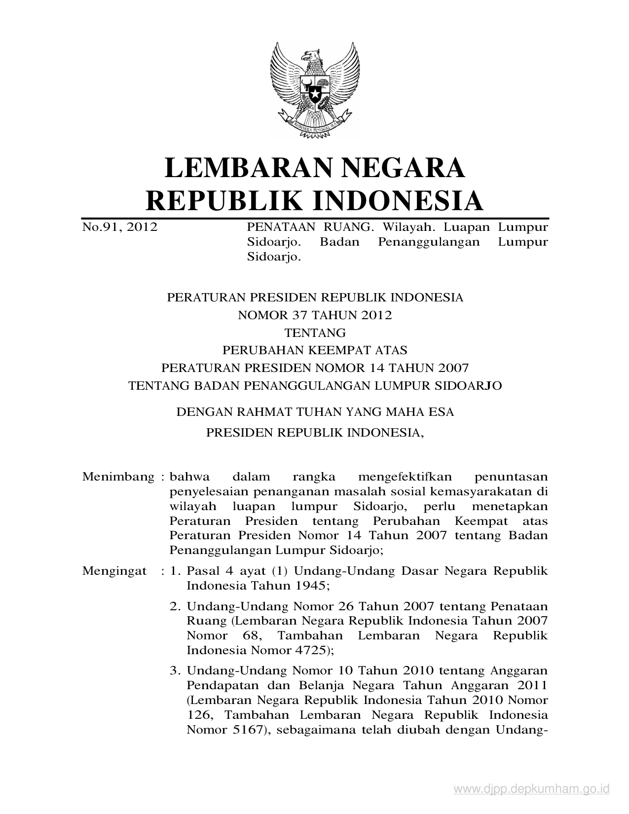 PERPRES Nomor 37 Tahun 2012 | Peraturan Presiden Nomor 37 Tahun 2012 tentang PERUBAHAN KEEMPAT ATAS PERATURAN PRESIDEN NOMOR 14 TAHUN 2007 TENTANG BADAN PENANGGULANGAN LUMPUR SIDOARJO