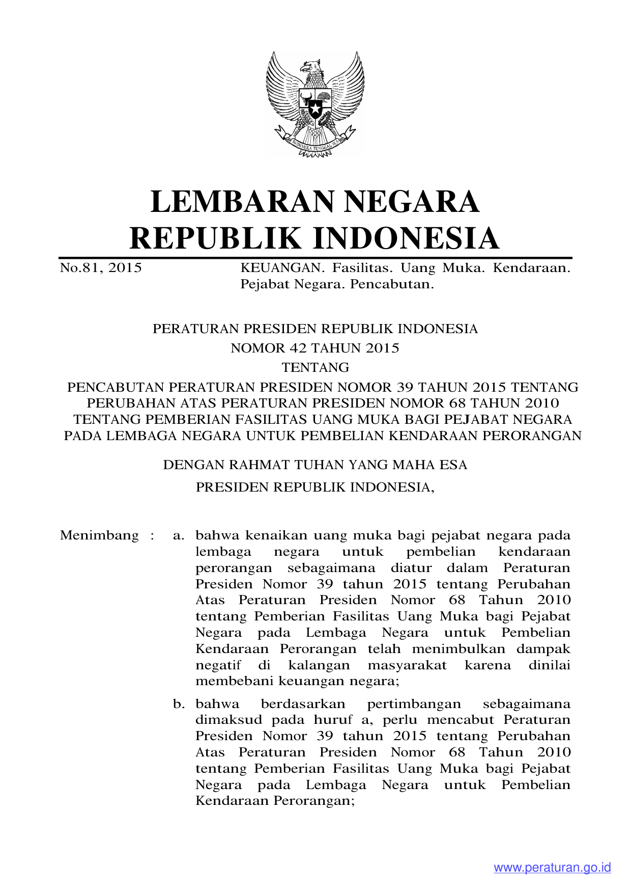 PERPRES Nomor 42 Tahun 2015 | Peraturan Presiden Nomor 42 Tahun 2015 tentang PENCABUTAN PERATURAN PRESIDEN NOMOR 39 TAHUN 2015 TENTANG PERUBAHAN ATAS PERATURAN PRESIDEN NOMOR 68 TAHUN 2010 TENTANG PEMBERIAN FASILITAS UANG MUKA BAGI PEJABAT NEGARA PADA LEMBAGA NEGARA UNTUK PEMBELIAN KENDARAAN PERORANGAN