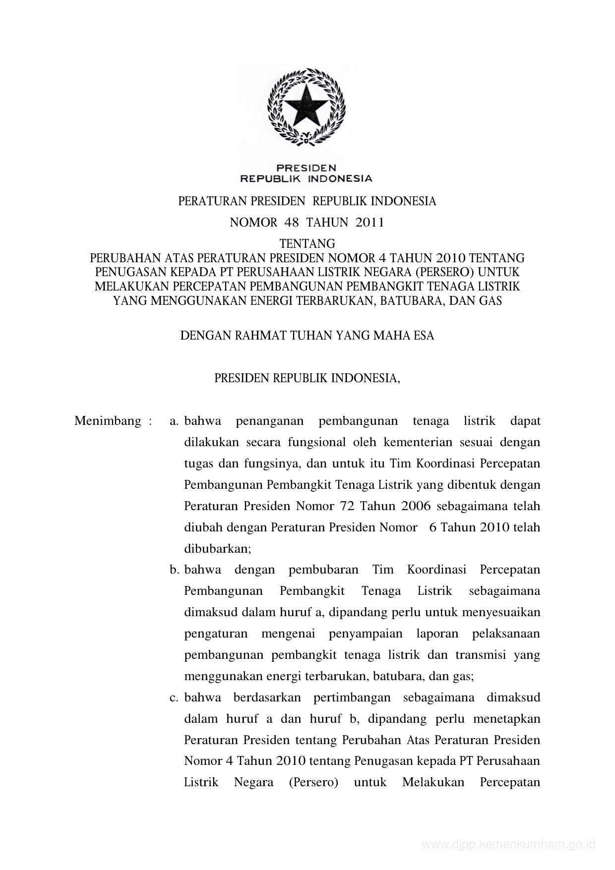 PERPRES Nomor 48 Tahun 2011 | Peraturan Presiden Nomor 48 Tahun 2011 tentang PERUBAHAN ATAS PERATURAN PRESIDEN NOMOR 4 TAHUN 2010 TENTANG PENUGASAN KEPADA PT PERUSAHAAN LISTRIK NEGARA (PERSERO) UNTUK MELAKUKAN PERCEPATAN PEMBANGUNAN PEMBANGKIT TENAGA LISTRIK YANG MENGGUNAKAN ENERGI TERBARUKAN, BATUBARA, DAN GAS