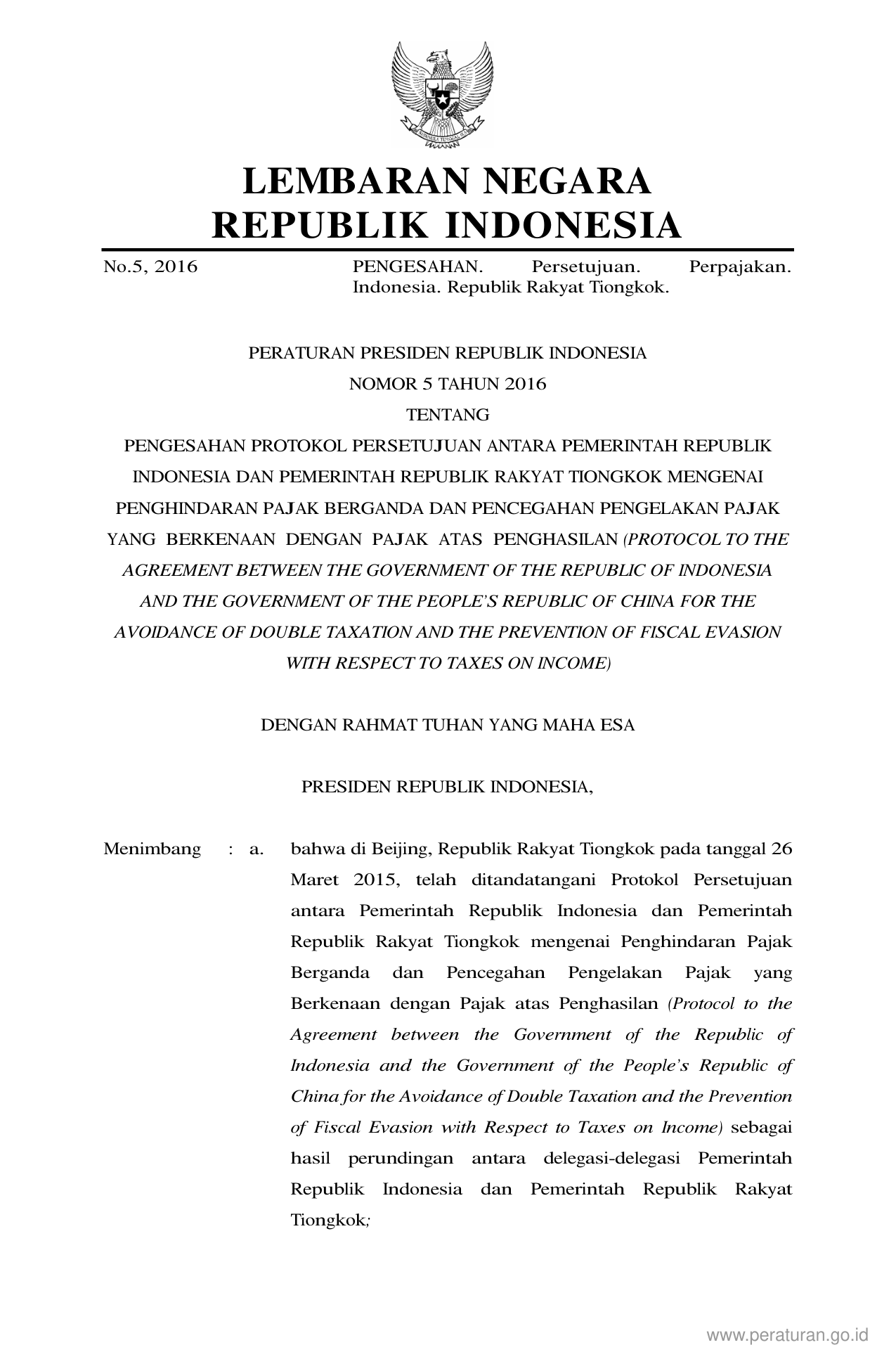 PERPRES Nomor 5 Tahun 2016 | Peraturan Presiden Nomor 5 Tahun 2016 tentang Pengesahan Protokol Persetujuan Antara Pemerintah Republik Indonesia Dan Pemerintah Republik Rakyat Tiongkok Mengenai Penghindaran Pajak Berganda Dan Pencegahan Pengelakan Pajak Yang Berkenaan Dengan Pajak Atas Penghasilan (Protocol To The Agreement Between The Government Of The Republic Of Indonesia And The Government Of The People’s Republic Of China For The Avoidance Of Double Taxation And The Prevention Of Fiscal Evasion With Respect To Taxes On Income)