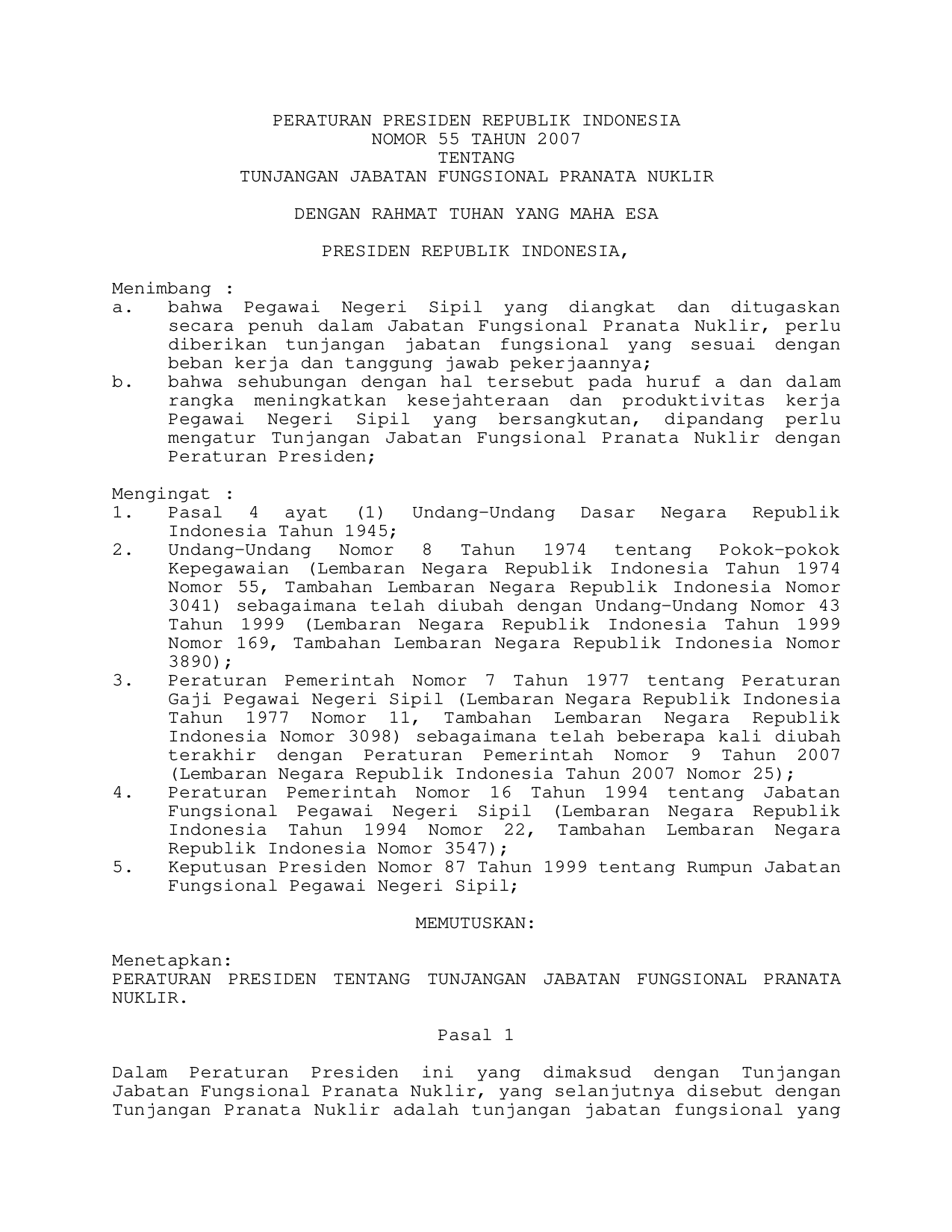 PERPRES Nomor 55 Tahun 2007 | Peraturan Presiden Nomor 55 Tahun 2007 tentang TUNJANGAN JABATAN FUNGSIONAL PRANATA NUKLIR