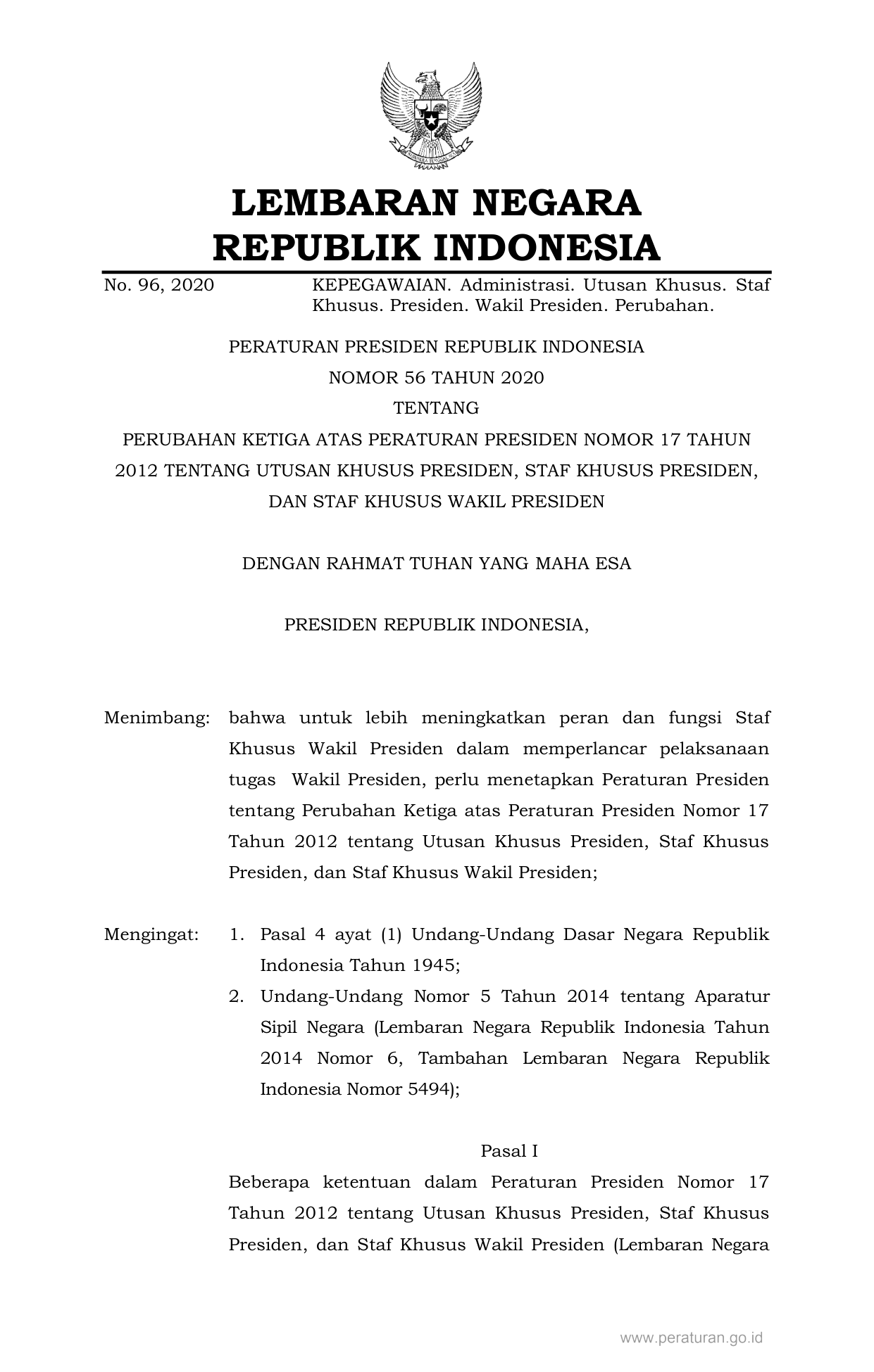 PERPRES Nomor 56 Tahun 2020 | Peraturan Presiden Nomor 56 Tahun 2020 tentang PERUBAHAN KETIGA ATAS PERATURAN PRESIDEN NOMOR 17 TAHUN 2012 TENTANG UTUSAN KHUSUS PRESIDEN, STAF KHUSUS PRESIDEN, DAN STAF KHUSUS WAKIL PRESIDEN